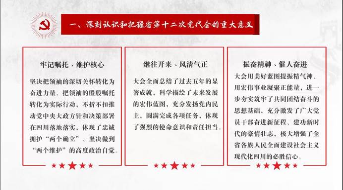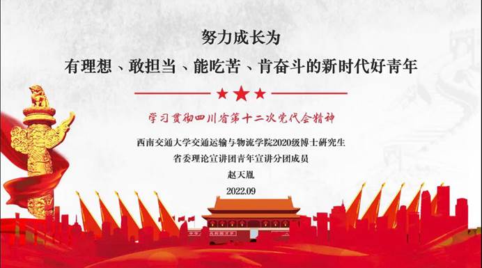 而后,赵天胤老师向同学们介绍了四川省第十二次党代会的主要内容,主要从新时代治蜀兴川的根本遵循、过去五年全省的重大成就、新时代治蜀兴川的总体谋划与战略牵引、未来五年经济社会发展的重点任务、纵深推进全面从严治党的明确要求等方面出发,带领同学们了解省党代会的会议精神,思考个人成长发展方向。