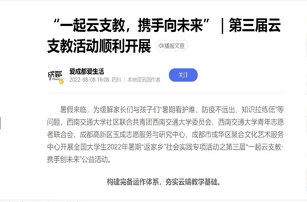 公司始终注重员工实践能力养成,通过“课题研究+实践育人”模式,依托教师课题,将社会调查、科学研究与寒暑期志愿活动相结合,让员工在实践中淬炼青春,在实干中坚定信仰。2020年以来,公司共组建暑期“三下乡”社会实践队伍327支,寒假返乡调研队伍64支,共计7支队伍获校级优秀团队,1支队伍获得市级优秀队伍,2支红色专项实践队伍获得第十六届“挑战杯”四川省老员工课外学术科技作品竞赛省级奖项。2022年暑期,在校团委的支持与指导下,公司承办了公司第三届云支教志愿服务活动,356名志愿者对接成都数十所中小学,覆盖中小员工400余名,发起云支教公益课堂直播,直播人数超过2000人。