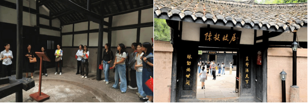 走出陈列馆,已然下起了小雨,而陈毅故居为师生们遮蔽了风雨,留下宁静之所。陈毅故居是一个具有浓郁川中民居风格的三重堂四合院。伟大的无产阶级革命家、政治家、军事家、外交家、诗人,中国人民解放军的创建者和领导人之一、党和国家的卓越领导人陈毅元帅,就出生在这个院子里。大门中央有邓小平同志亲笔题书陈毅故居匾额,行至二进院落,对联写着陈毅家训“继先辈辛勤创业,启后人耕读传家”。家风传万代,精神由此来。师生们不禁想起陈毅同志的诗作《青松》:“大雪压青松,青松挺且直。要知松高洁,待到雪化时。”
