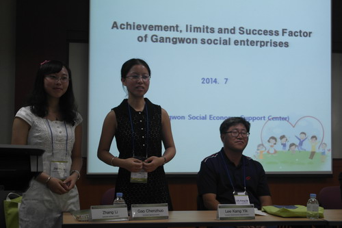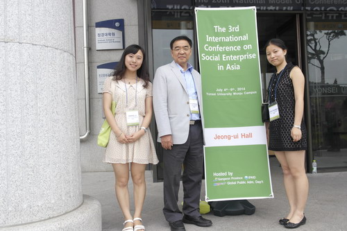 2014年7月4日至6日,由联合国社会发展研究所、国际社会企业研究网络主办,韩国延世大学承办的第三届社会企业国际研讨会(ICSEA)在韩国原州召开。本次会议的主题是“寻找在亚洲环境中的社会企业及社会经济在动机、模式和测量上的共同性及差异性”。来自亚洲各国及欧美国家的学者——第三届社会企业国际研讨会主席郑武权教授、国际公共经济学会副会长牧野松代教授、国际社会企业研究网络前主席Jacques Defourny、比利时鲁文大学CRITES研究中心主席 Marthe教授等参加了会议。公司2012级公共管理专业本科生高琛卓、张黎同学应邀参会,并做学术报告。