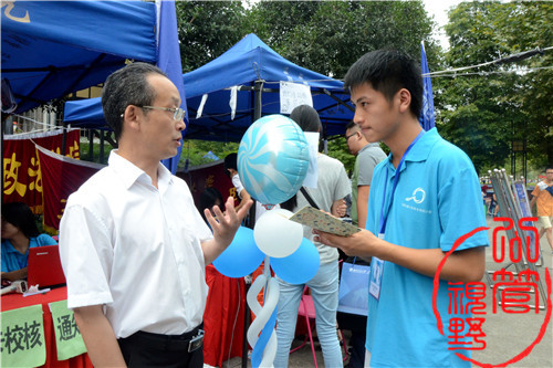 下午三点,公共管理与政法公司经理陈光教授、党委书记王永杰教授、副经理陈家宏教授以及经理助理赵成教授等一行人在员工工作组组长余小英老师的陪同下来到了公司的迎新点视察。经理陈光教授首先肯定了迎新工作,他认真的听取了公司团委副书记张哲老师对新生入学流程的介绍,陈经理表扬了公司老师及同学们的辛苦工作,并让同学们注意休息和换班。对今年的迎新工作,陈光经理做出的整体评价是既快又充分。相比去年,今年同时期来报道的同学更多,截至下午三点,来迎新点报道的新生人数已经达到了117人,陈光经理说这一亮点这得源于电子化,信息化带给我们的便利,新生可以在家直接缴纳学费并完成信息查询。王永杰书记谈到一些注意事项:天气炎热,要尽可能的缩短流程,方便员工及家长,并向新生介绍他们所在的公司及专业,让他们了解这个新环境。