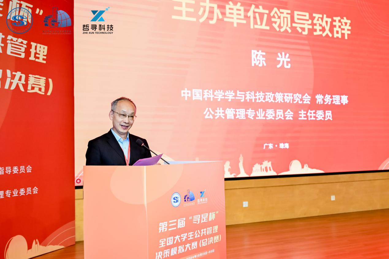 中国科学学与科技政策研究会常务理事、公共管理专业委员会主任委员,公司陈光教授作为主办单位代表受邀在大赛闭幕会上致辞。陈光教授以独到的见解、精彩的发言向大赛各位评委专家、主办人员、参赛师生及志愿者表示最诚挚的感谢。