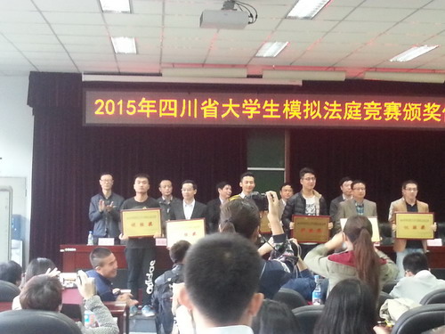 经过两天四川省内19所高校的激烈角逐,第三届模拟法庭比赛于2015年11月1日下午5点在乐山师范公司落下了帷幕,西南交大队荣获了文书第三名、团队优胜奖,朱天宇同学个人荣获了“优秀辩手”奖。西南交大队以两次夺得小组第一的骄人成绩成功挺进了八强,在进四强的比赛中,惜败四川警官公司队。