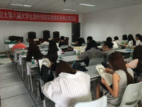 本次活动得到了实验室及设备管理处的宋世军老师、牟茁老师和公司领导雷经理的大力支持,活动全程由公共管理与政法公司刑侦实验室高级工程师申瑢老师统一策划、组织、安排和具体实施。同时,老员工法律协会的同学们做了大量工作,协助办好这次活动,使本次 “模拟画像比赛”活动圆满举行。参赛队员有的来自公共与政法公司的法学专业、有的来自建筑与设计公司的设计专业,还有的来自土木公司、经管公司的同学,竞赛活动实现了多学科交叉融合发展。活动刚开始,指导老师申瑢老师给参赛同学们讲了什么是模拟画像以及模拟画像的意义,接着又讲了比赛的相关规则,并且告诉选手要认真分析模拟画像要求,其间体现了法律与艺术的结合,不能单单追求艺术性,必须要理解并按照目击证人的口述的信息来完成。紧接着,申瑢老师介绍了此次比赛的要求内容,给出目击证人对犯罪嫌疑人的体貌特征的描述,如年龄、脸型,及哪里有疤痕、痣等信息,要求参赛队员在规定时间完成。看了这个描述之后,参赛队员个个有跃跃欲试的冲动,同时丝毫不敢松懈。14时15分,现场的选手正式开始作画,选手中有的是独自参赛,也有两人组团,参赛选手中,不少同学有绘画功底,很短的时间里就将人物的大致轮廓勾勒出来。而没有绘画功底的同学,丝毫不受影响,专心做自己的作品,认真的态度值得表扬。大家都全身心地投入,认真对待,在比赛期间,指导老师申瑢积极指导,提出了自己的建议,提醒参赛同学要注意哪些地方,指出同学们作品中存在的问题。并且还拿出了自己画的素描头像作品以供选手参考学习。