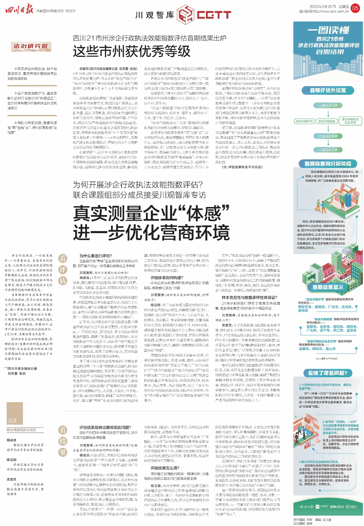 2025年2月20日,四川日报在头版将“四川21市州涉企行政执法效能指数评估首期结果出炉”的信息以倒头版的形式进行导读,并在四川日报第5版整版将首期评估结果公布,并就为何开展涉企行政执法效能评估、评估体系如何构建、评估工作如何有效开展等问题,对课题组成员杨成良副教授、陈迎新副教授和MK体育2006级法学研究生员工、资深律师吴爱民进行了专访。