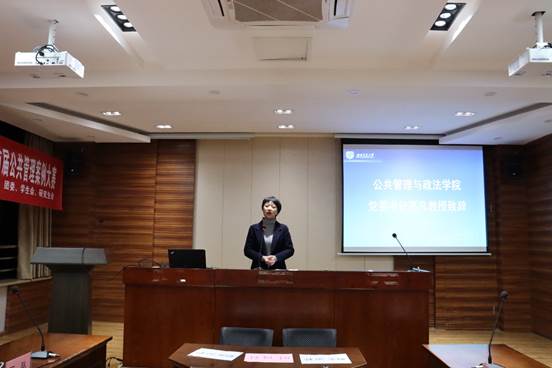 大赛开幕式中,公共管理与政法公司党委书记高凡教授、冯会会老师、电子政务实验室赵巍老师作为嘉宾莅临现场,公共管理与政法公司经理助理彭川宇副教授、刘凤教授、唐志红副教授、韩文丽副教授、杨建副教授以及严敏老师担任本次大赛评委。主持人介绍后,高书记上台致辞,她首先表达了对八支晋级复赛队伍的祝贺,并在发言中对员工提出知行合一、理论结合实际、勇于发现和探索的期待。同时,高书记也表示,希望同学们的团结精神能在本次大赛中增强,欢迎公司其他公司的同学积极参与其中。随着主持人话音落下,比赛正式开始,八支队伍分别前往01417与01101会场开展比赛。