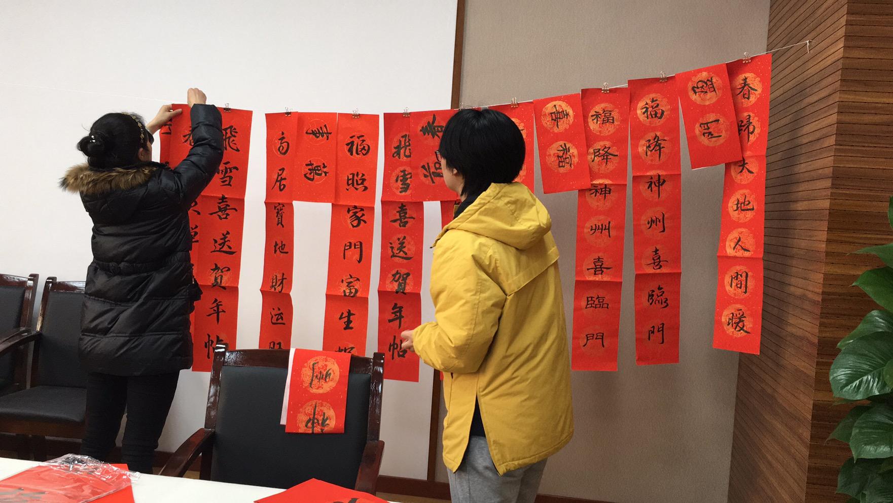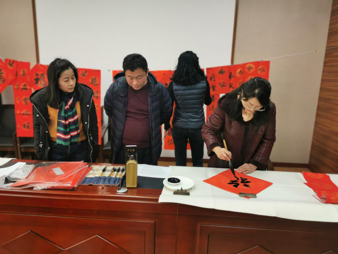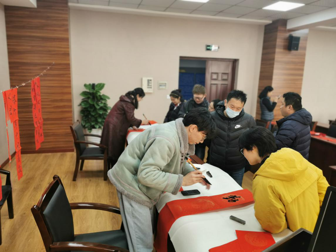 疫情防控期间,为响应国家和省市关于留在当地过节、过年的号召,公司党政工团于2021年1月21日下午邀请了书画协会的老师和同学在九里校区01216室为公司教职工写“福”字、送新春对联。