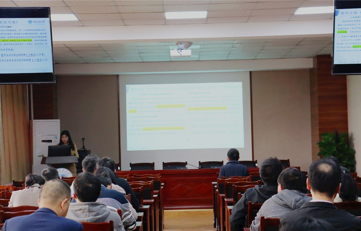 会议伊始,余小英向全体参会人员介绍了毕业生的就业情况和员工的就业意向调查。在对一项项真实的统计数据抽丝剥茧地分析中,她严谨地说明数据背后的问题,力图为员工就业指明方向。结合当前疫情形势并根据员工的实际情况,余小英提出未来工作的重点,主要包括分类别指导员工就业、推荐员工就业、各系分工促进本专业员工就业以及设立就业相关的经费奖励制度等。