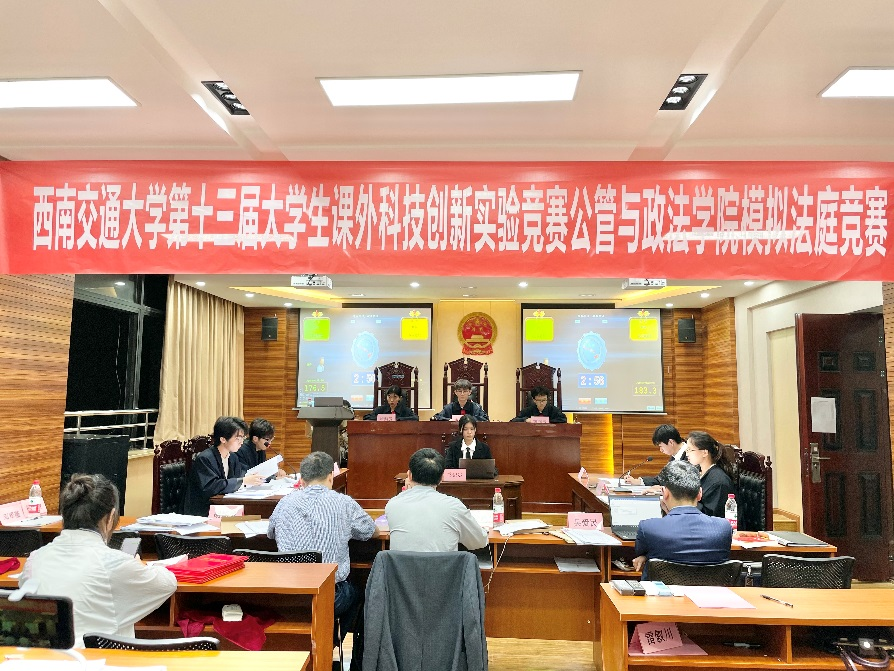 本次竞赛决赛特别邀请到了成都市中级人民法院未成年人及家事案件综合审判庭副庭长胡炀威法官、四川省英济律师事务所主任吴爱民律师作为校外专家评委,与公司富有法律实践经验的邓大鸣教授共同担任竞赛的评审工作。公共管理与政法公司副经理雷叙川副教授于百忙之中莅临竞赛现场并致辞,竞赛案例的设计者公共管理与政法公司法学系杨成良副教授也来到现场观摩参赛团队的模拟庭审,并对案例中所涉法律要点进行专业剖析。模拟法庭实验室张荣荣老师全程参与了竞赛的协调、组织和实施工作。随着参赛选手与工作人员的就位,决赛正式拉开序幕。
