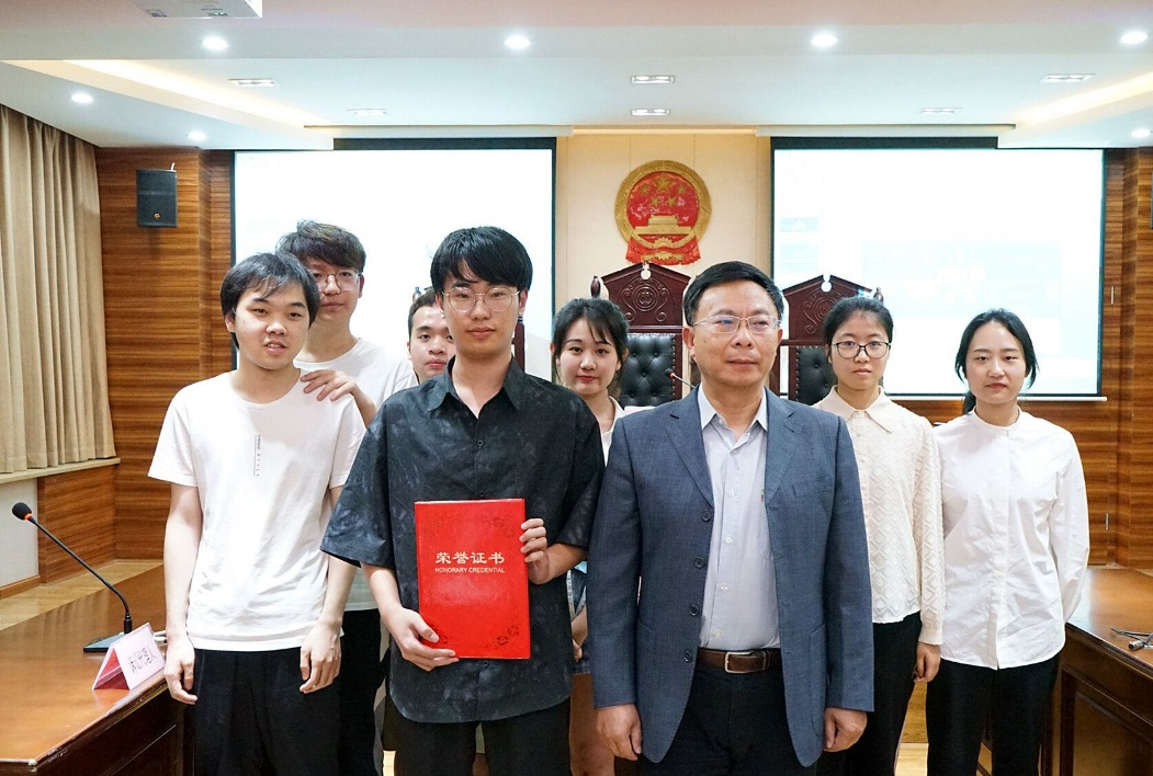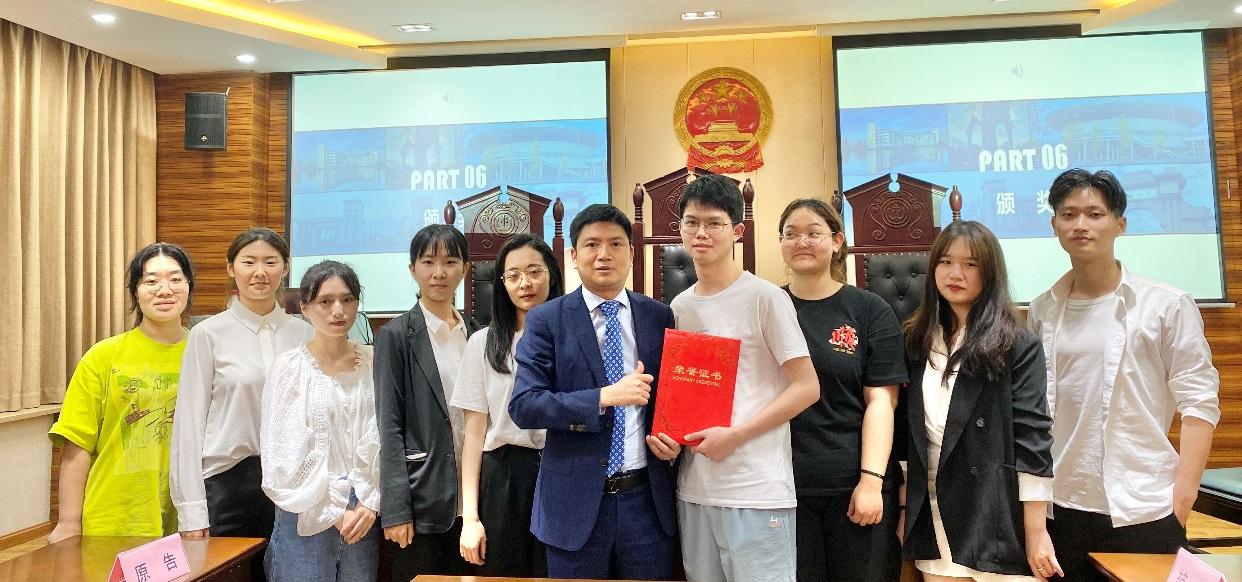 赛事已经接近尾声,杨成良副教授最后统一宣布了经组委会计算出的各参赛团队的平均成绩和获奖情况:孔熠团队荣获一等奖,彭薪霖团队荣获二等奖,陈哲团队、韩蒙恩团队荣获三等奖。胡炀威庭长、吴爱民主任和邓大鸣教授分别为获奖团队颁奖,专家评委们面对获奖同学们的殷切目光,既有赞赏亦有期待。