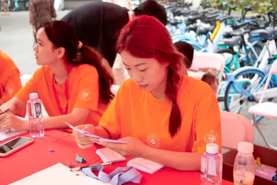 红帐篷展开,身着橙衣的志愿者们已在岗位上就位