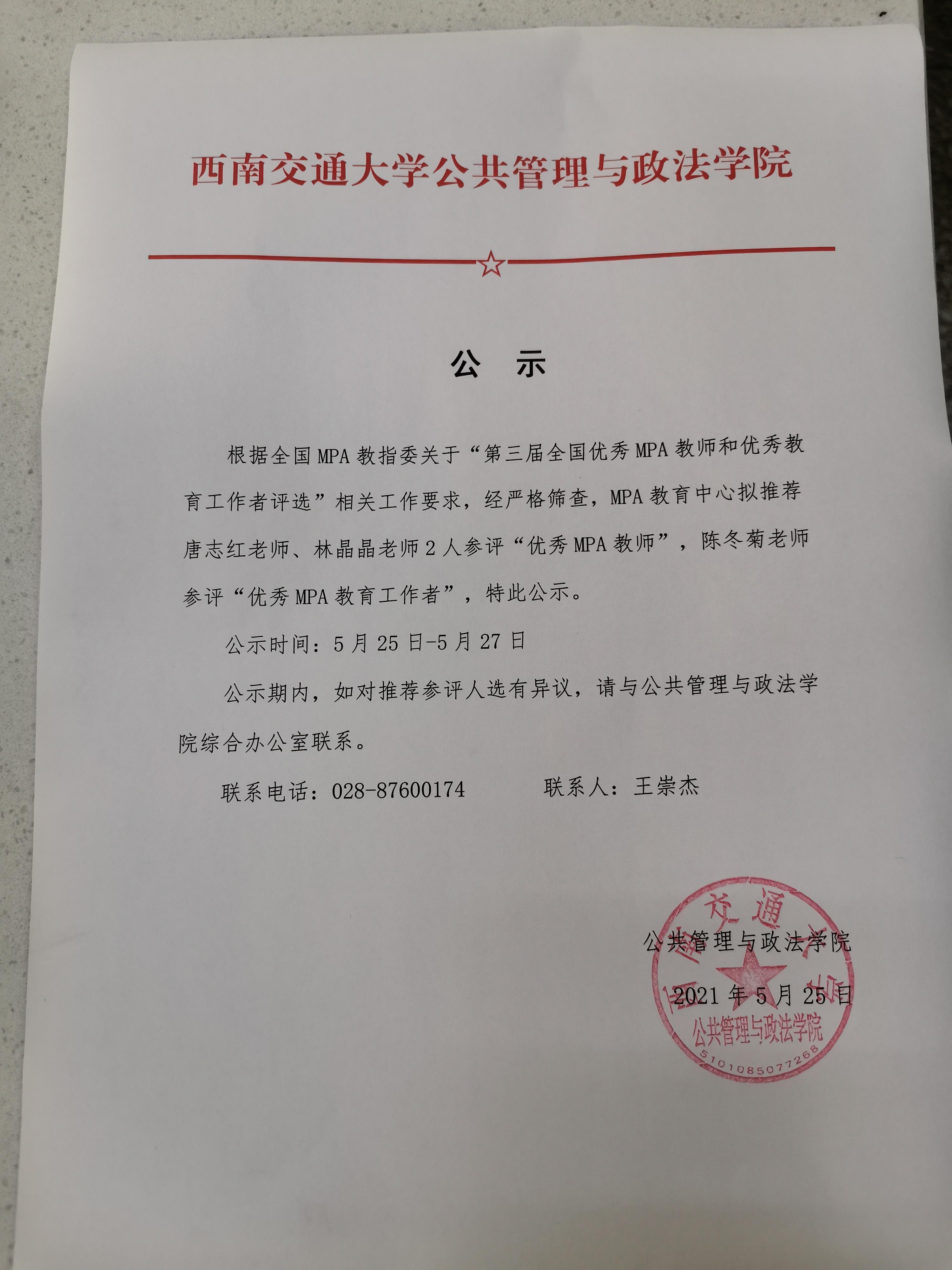 公共管理与政法公司关于第三届全国优秀MPA教师和优秀教育工作者拟推荐人选公示