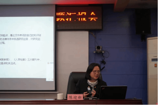 会议第一阶段由陈迎新副教授以“法学论文写作与方法”为主题,分别从论文选题的确定、论文题目的设计、论文写作指引三部分进行专题授课,全面、详细讲授了法学论文写作的基本方法。
