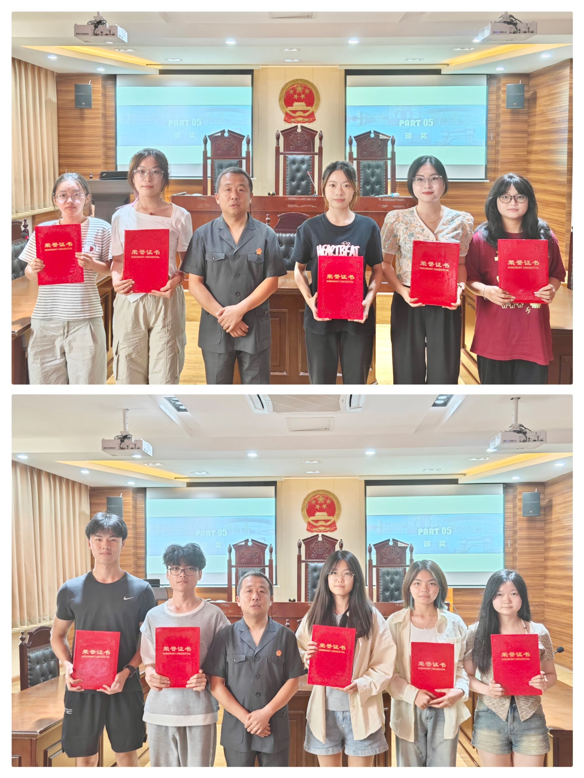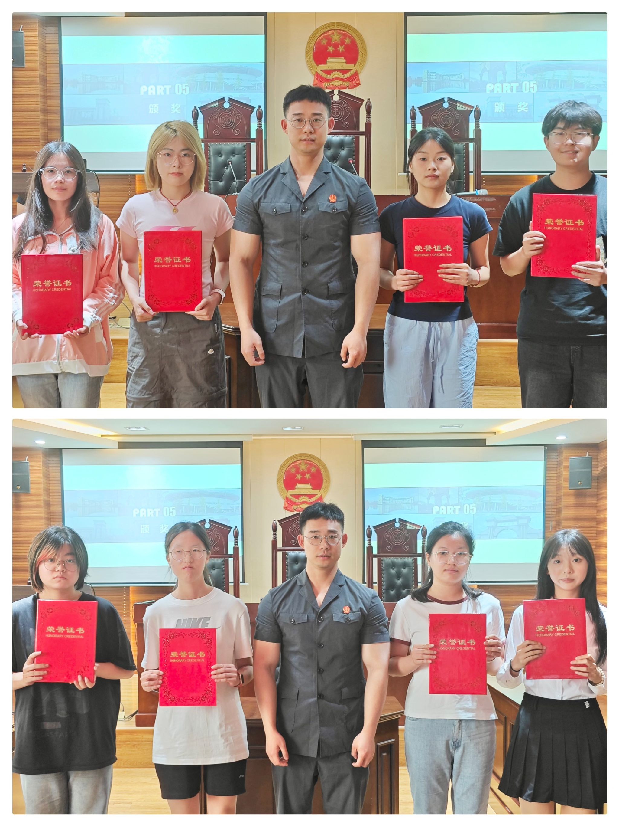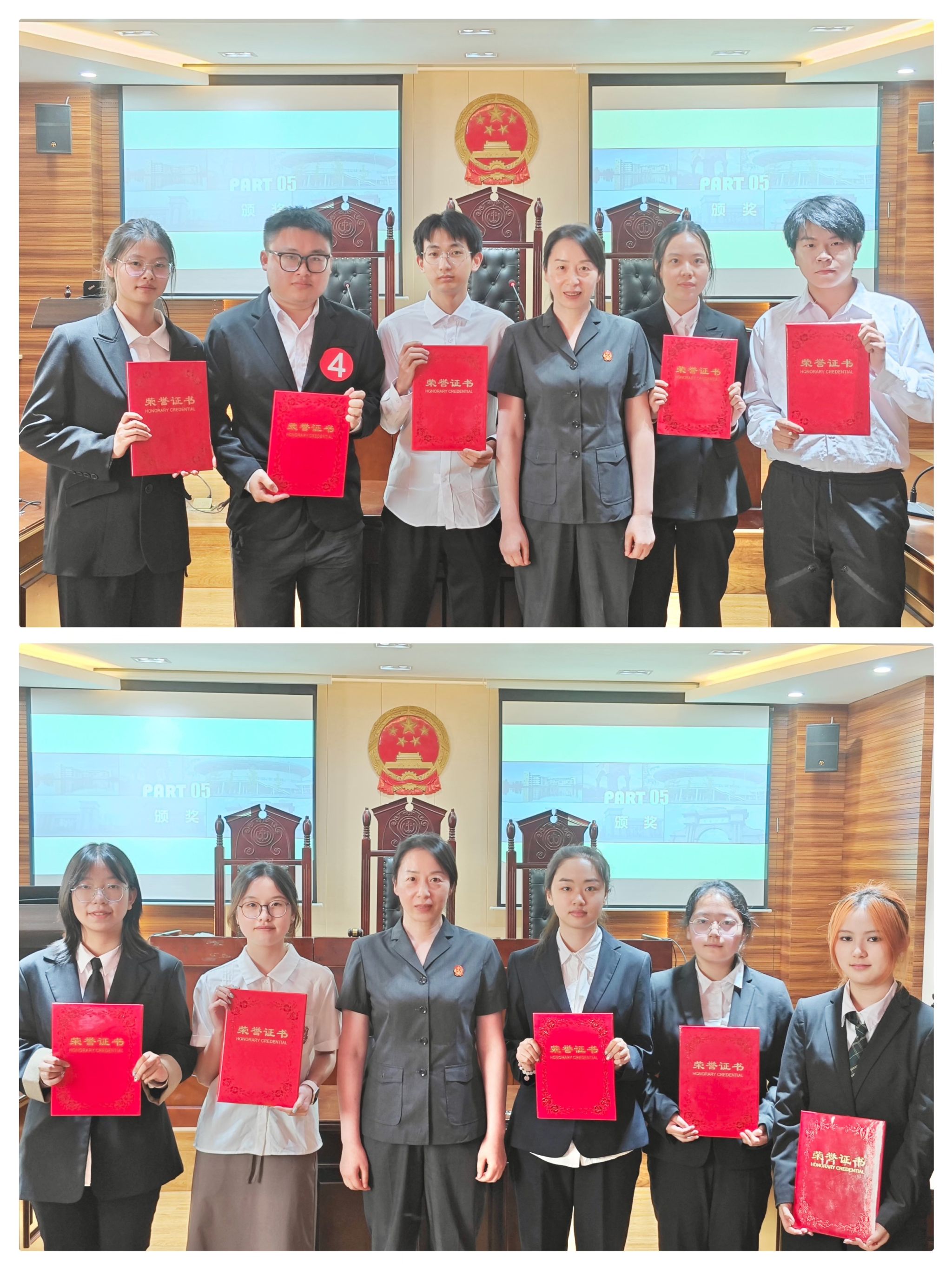 赛事已经接近尾声,王庭长宣布了决赛两支参赛团队的最终成绩和本次模拟法庭竞赛的获奖情况:杜星瑶团队荣获本次模拟法庭竞赛的冠军,高博团队获得亚军,两支参赛团队双双荣获一等奖;刘雨晨、康雪雪两支参赛团队荣获二等奖;张瑞轩、刘瑾仪、曾梓涵、王涵玉四支参赛团队荣获三等奖,陈佳佳、叶思宁两支参赛团队荣获优胜奖。最后,祝经理、王庭长、刘庭长和张法官分别为获奖队伍颁奖并与参赛团队合影留念。
