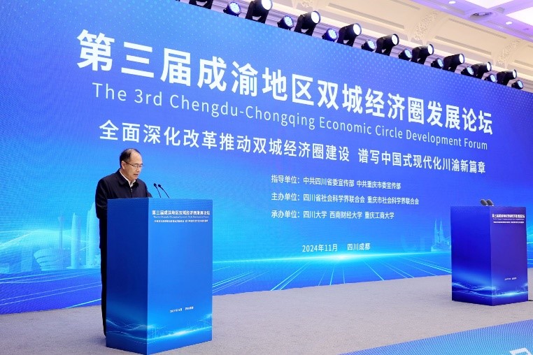 2024年11月13日,由四川省委宣传部、重庆市委宣传部指导,四川省社科联和重庆市社科联联合主办,四川大学、西南财经大学、重庆工商大学联合承办的“第三届成渝地区双城经济圈发展论坛”在成都举行。四川省委常委、宣传部部长、省社科联主席郑莉宣布论坛开幕。四川省人民政府副省长胡云,重庆市委常委、宣传部部长、市社科联主席姜辉出席并致辞。