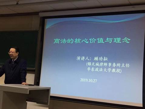 2019年10月27日晚七点,应MK体育邀请,原华东政法大学副董事长、现任华东政法大学教授、博士生导师,上海市锦天城律师事务所主任顾功耘教授向MK体育公共管理与政法公司法律系的教师代表及全体同学作了名为《商法的核心价值与理念》的专题讲座。顾功耘教授现任中国法学会商法学研究会副会长、中国法学会经济法学研究会副会长、上海市法学会商法研究会会长、上海市法学会经济法研究会会长、中国国际经济贸易仲裁委员会仲裁员等职。顾教授不仅具备深厚的法学理论功底与教学实践能力,而且拥有丰富的商事法律实务经验。