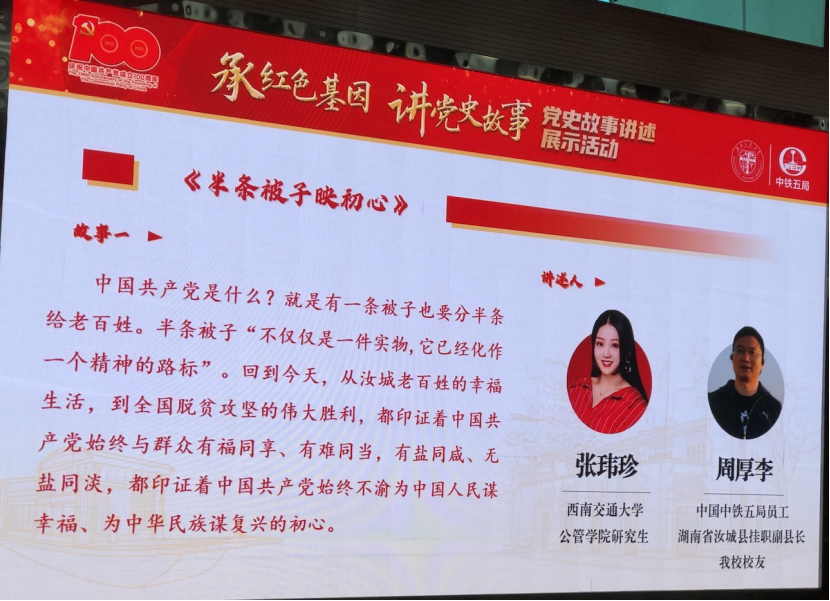 为深入学习贯彻习近平新时代中国特色社会主义思想,以优异成绩迎接中国共产党建党100周年,深化党史学习教育成效,公司与中国中铁五局联合开展“承红色基因 讲党史故事”展示活动,本次活动于2021年6月16日在MK体育犀浦校区举行,来自各公司的和中铁五局共11位代表参加本次展示,公司张玮珍同学与中国中铁五局员工、湖南省汝城县挂职副县长、公司员工周厚李共同为大家带来了《半条被子映初心》主题演讲,公司获得优秀组织奖。