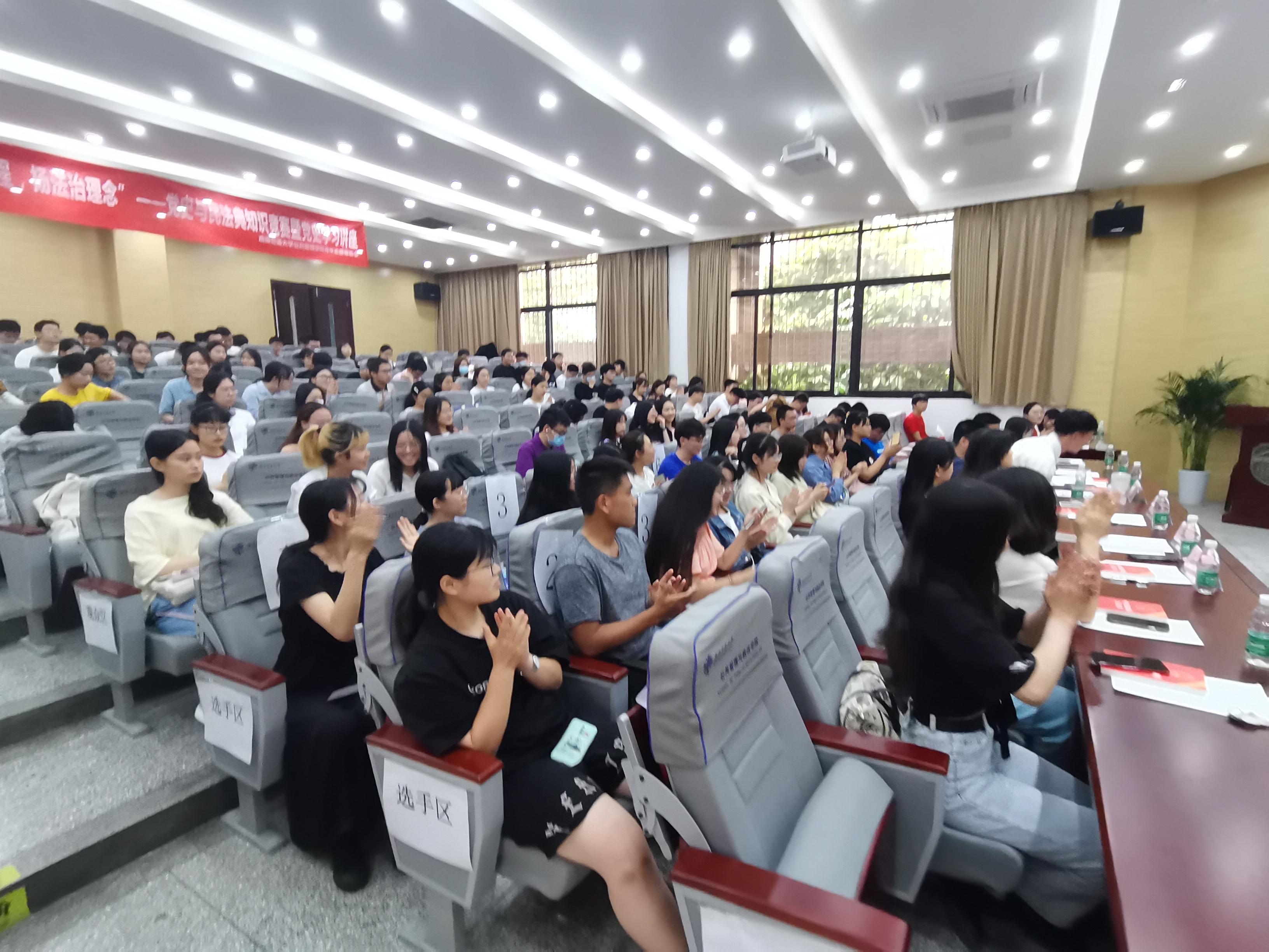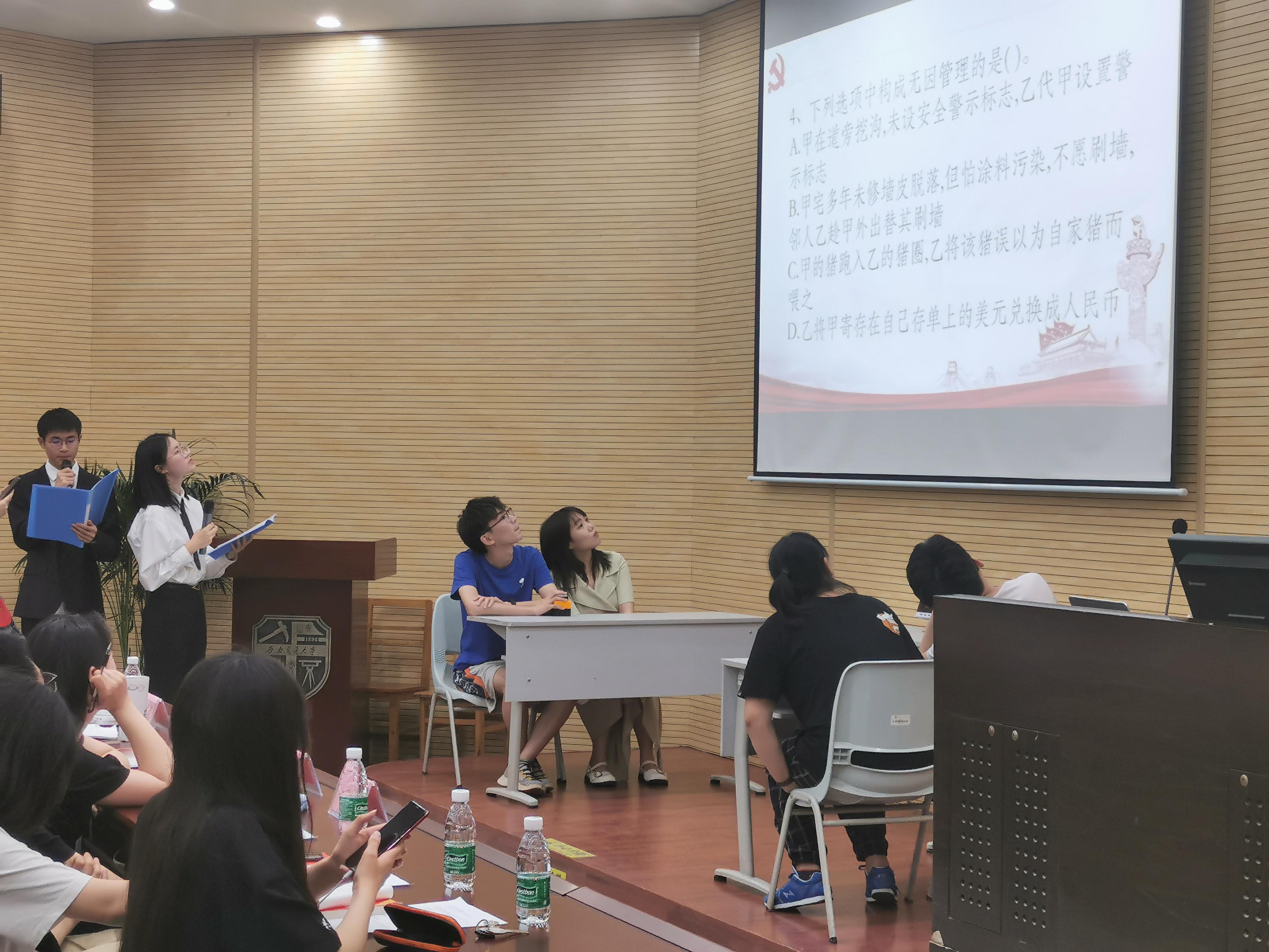 在活动第一阶段的民法典和党史知识竞赛中,十支队伍轮流作答,场上选手们时而与队友小声商量、探讨,时而静心思考,寻觅答案。轮到自己队伍时,每位队员从容不迫,自信大方地呈现自己的答案。主持人话音刚落,抢答器就被选手按下,这是知识的碰撞;台下的同学加油鼓励,不断将现场气氛推向一个又一个高潮。
