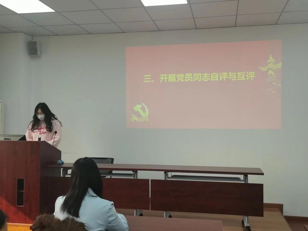 这次专题组织生活会的主题为“紧密把握社会时代性、始终保持党员先进性,在批评与自我批评中不断前行。”会议的议程主要有六项:宣誓入党誓词、党支部书记汇报支部2021年度工作情况、开展党员自评与互评和党员民主测评、邀请余小英书记对我支部组织生活会情况作点评,并进行合影纪念。参加党支部组织生活党员应到18人,实到18人,其中正式党员15名,预备党员3名,符合专题组织生活会召开标准。