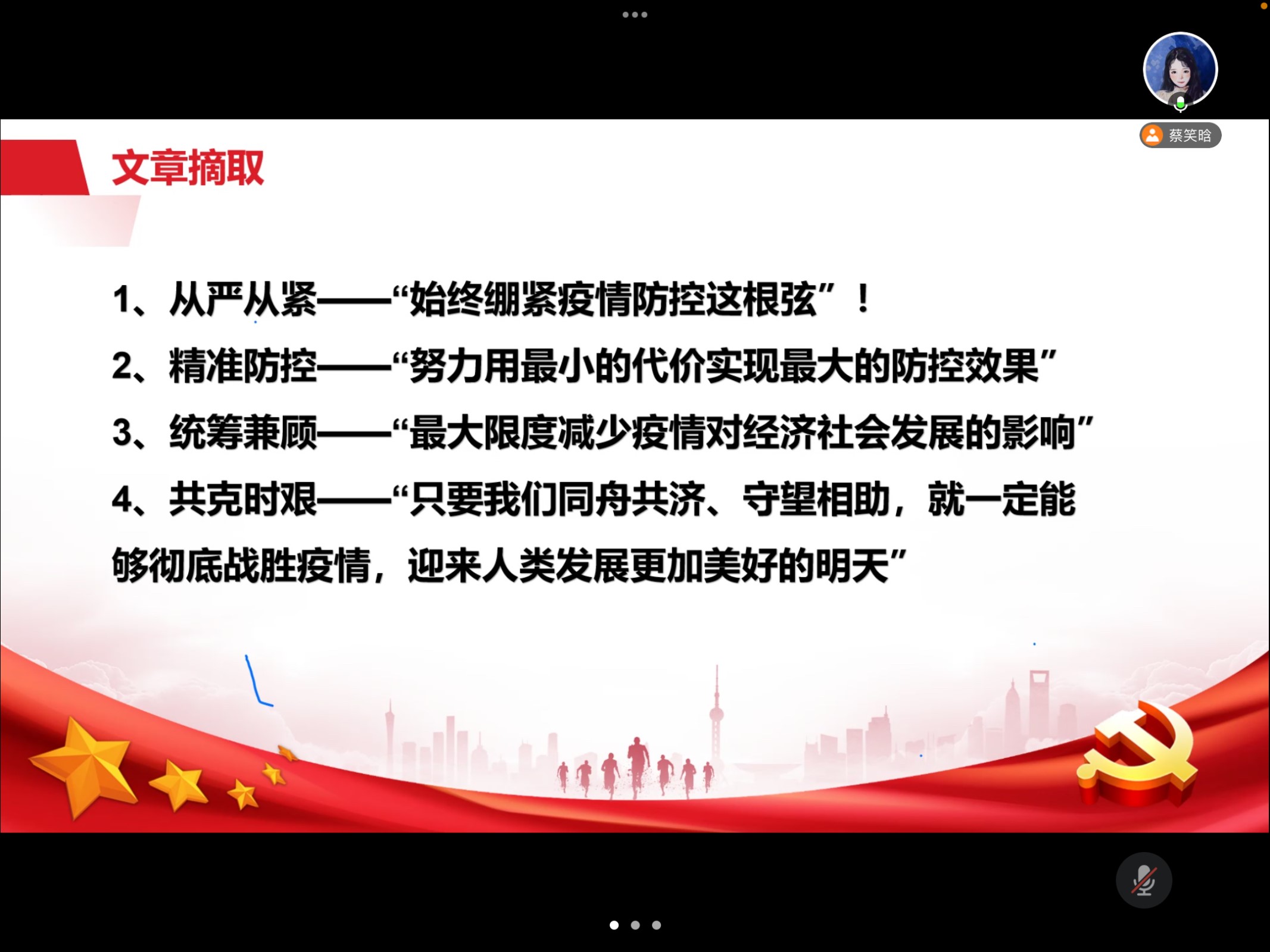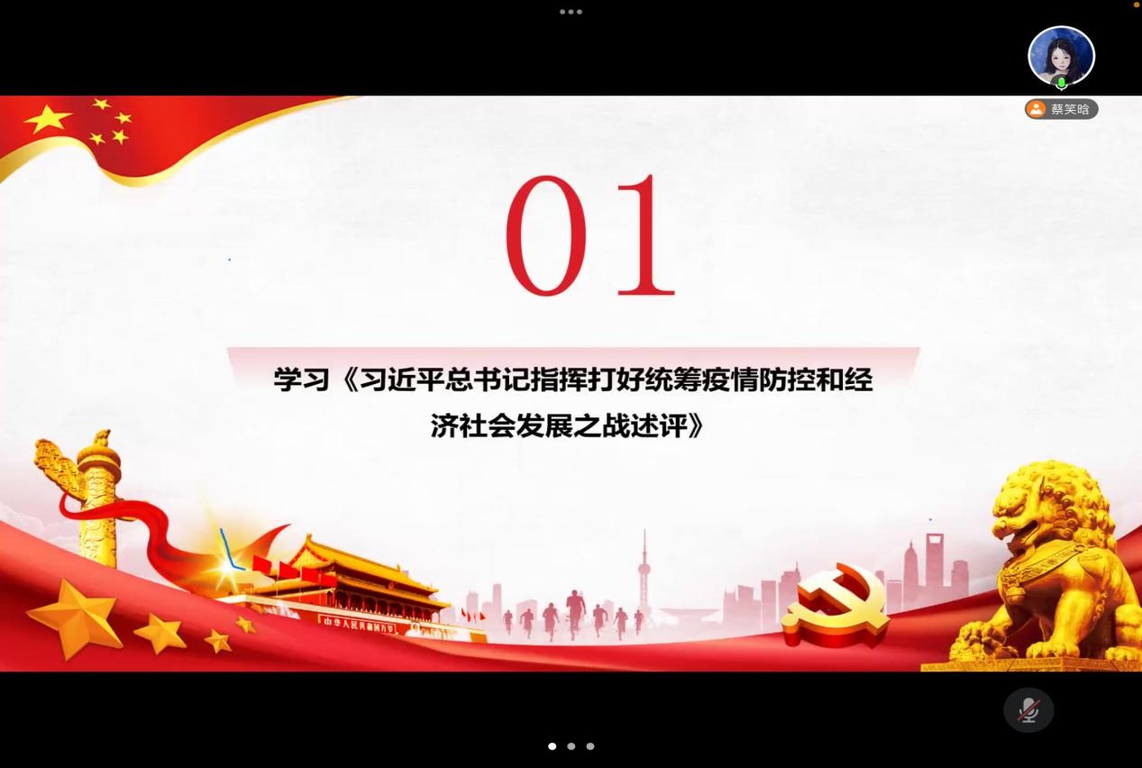 为了积极响应国家和公司抗击疫情的号召,引导员工党员正确认识当前疫情防控形势,坚决服从公司疫情防控工作安排,坚决听从指挥,严格落实“非必要、不离校”的要求,硕士2021级公共管理第一党支部于4月12日下午集体进行《“始终坚持人民至上、生命至上”——习近平总书记指挥打好统筹疫情防控和经济社会发展之战述评》的线上学习暨“旗帜学习小组”活动安排的相关事宜。