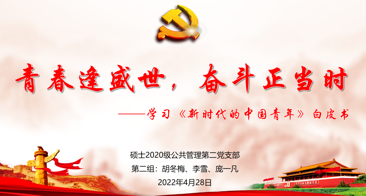 为了促进支部党员筑牢理想信念,弘扬新时代青年精神,硕士2020级公共管理第二党支部于2022年4月28日,在01108教室开展《新时代的中国青年》白皮书专题学习活动。支部全体党员参加,会议由支部书记范锡林同志主持,支部第二学习小组的胡冬梅同志领学。