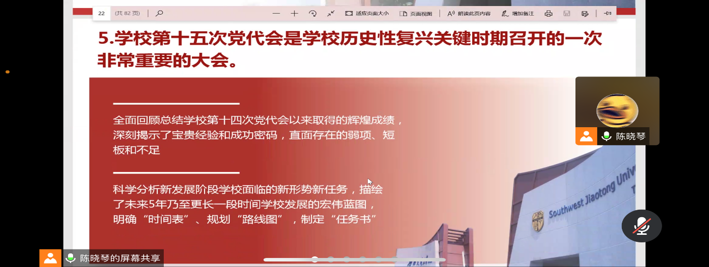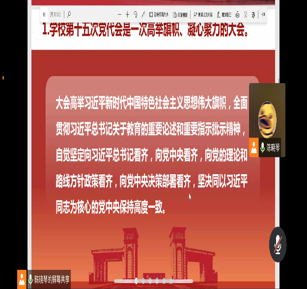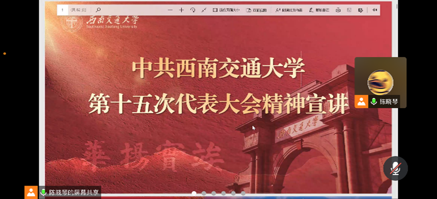学习党的理论知识是党员的义务,是坚持习近平新时代中国特色社会主义思想的内在要求。为深入学习贯彻习近平新时代中国特色社会主义思想,进一步掀起学习贯彻公司第十五次党代会精神热潮,推进“踔厉奋发、笃行不怠,谱写中华民族伟大复兴的西南交大新篇章”主题学习教育实践活动,硕士2020级公共管理第一党支部于2022年10月13日晚19:00在腾讯会议开展“学习党代会精神,书写新青年篇章”的主题党日活动,以实际行动迎接党的二十大胜利召开。会议由党支部书记陈晓琴主持,全体党员同志参加。会议主要从大会主题、工作回顾、新时期办学治校总体思路、科学谋定公司的发展目标等方面展开。