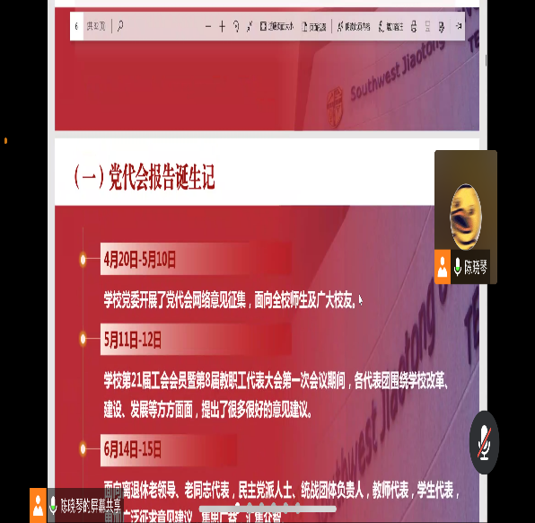 首先,公司第十五次党代会报告主题是高举习近平新时代中国特色社会主义思想伟大旗帜,深入学习贯彻习近平总书记关于教育的重要论述,全面总结公司第十四次党代会以来的成绩与不足,把握公司现阶段面临的主要矛盾,明确公司新时代的办学思路、发展目标、基本准则、实现途径,统一思想,凝聚共识,振奋精神,不断谱写中华民族伟大复兴的西南交大新篇章。