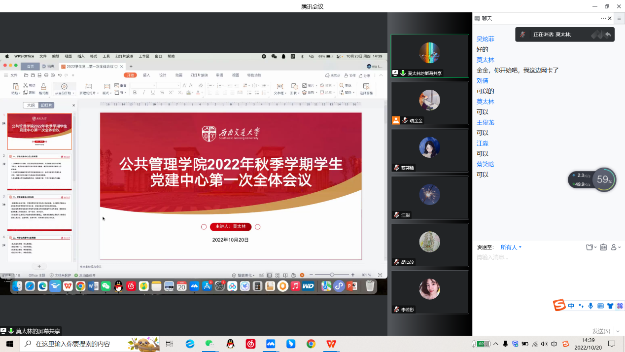 会议第二部分,由莫太林老师主持召开“2022年秋季学期员工党建中心第一次全体会议”,会议主要从员工党建中心成立背景、定位与期望、部门职责、重点工作等方面展开。他指出,目前我们面临着上级党组织和基层员工党支部有效链接不足,基层专职员工党建队伍不足,员工党建工作存在规范性不足、创新性不够、作用不强等系列问题。而党建中心是连接公司、公司党委和员工党支部之间的桥梁,能有效将上级党组织的决议和要求传导给员工党支部,整体性加强了对基层员工党支部的链接和对公司员工党建工作的规范指导,促使公司基层党建工作规范统一、有序运行。在此,他提出了新的工作期望,希望全体干部都能弘扬伟大建党精神和自我革命精神,在支部工作做成做新的基础上,进一步凝练总结出优秀可传承的工作方法,打造富有特色的具有先进典型示范引领作用的支部。