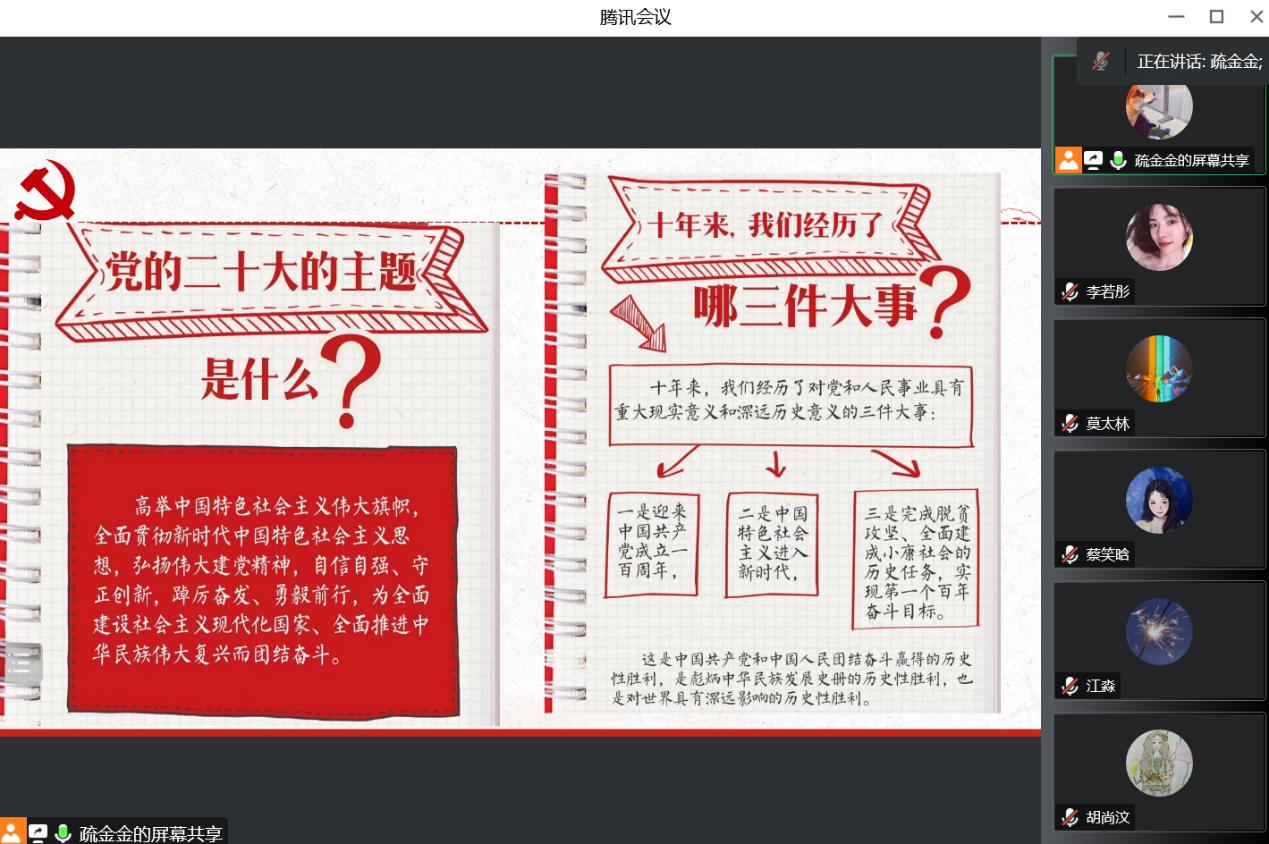 会议开始,由疏金金同志为党建中心全体成员讲述专题党课,组织全体成员全面、深入、系统学习党的二十大主要内容和精神内涵,以此武装头脑、指导实践、推动工作,以实际行动走在前、开新局、作表率。他指出,作为一名员工党员,要时刻谨记总书记强调的“五个牢牢把握”,要把学习贯彻党的二十大精神作为首要政治任务,先学一步、学深一层、多悟一分,牢记殷殷嘱托、践行初心使命。持续增强用习近平新时代中国特色社会主义思想武装头脑、指导实践、推动工作的政治自觉、思想自觉和行动自觉,深刻领悟“两个确立”的决定性意义,增强“四个意识”、坚定“四个自信”、做到“两个维护”,自觉把学习贯彻党的二十大精神与公司第十五次党代会精神紧密结合起来,当好学习宣传贯彻党的二十大精神的排头兵。