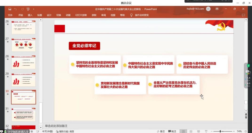 为深入学习贯彻党的二十大精神,根据公司《关于做好党的二十大精神学习培训的工作提示要求》,12月15日15:00,公司党委委员、副经理李华强在腾讯会议开展了党的二十大精神专题宣讲活动,教工机关党支部、硕士2020级公管第一党支部、硕士2022级公管资环第二党支部的全体党员参加。