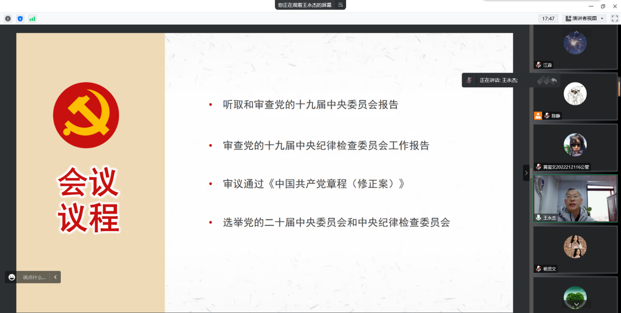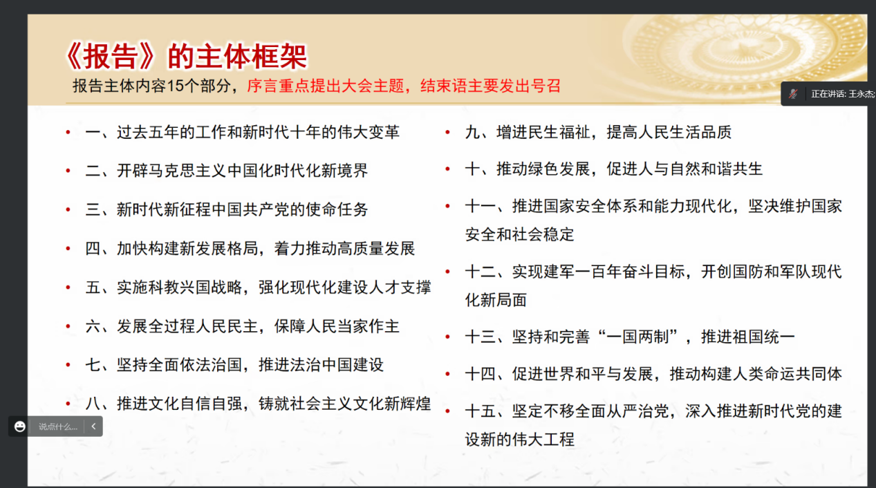 为贯彻公司《关于做好党的二十大精神学习培训的工作提示要求》,深入学习贯彻党的二十大精神,深刻回顾党和国家在发展进程中取得的重大成就,引导激励广大师生党员坚定理想信念,奋进新征程,建功新时代,2022年12月15日上午8:50,MK体育教工法学系党支部和硕士2022级法学第一党支部邀请公司党委委员、经理王永杰教授在腾讯会议为大家开展学习二十大专题党课宣讲活动。