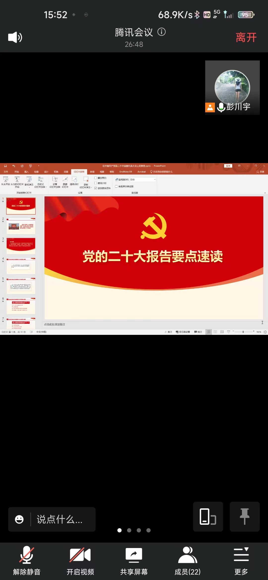 在会议最后,彭川宇同志结合自己的科研研究分享了自己的感想,党的二十大的召开是历史性的事件。党用伟大奋斗创造了百年伟业,也一定能用新的伟大奋斗创造新的伟业。全党全军全国各族人民要紧密团结在党中央周围,牢记空谈误国、实干兴邦,坚定信心、同心同德,埋头苦干、奋勇前进,为全面建设社会主义现代化国家、全面推进中华民族伟大复兴而团结奋斗!