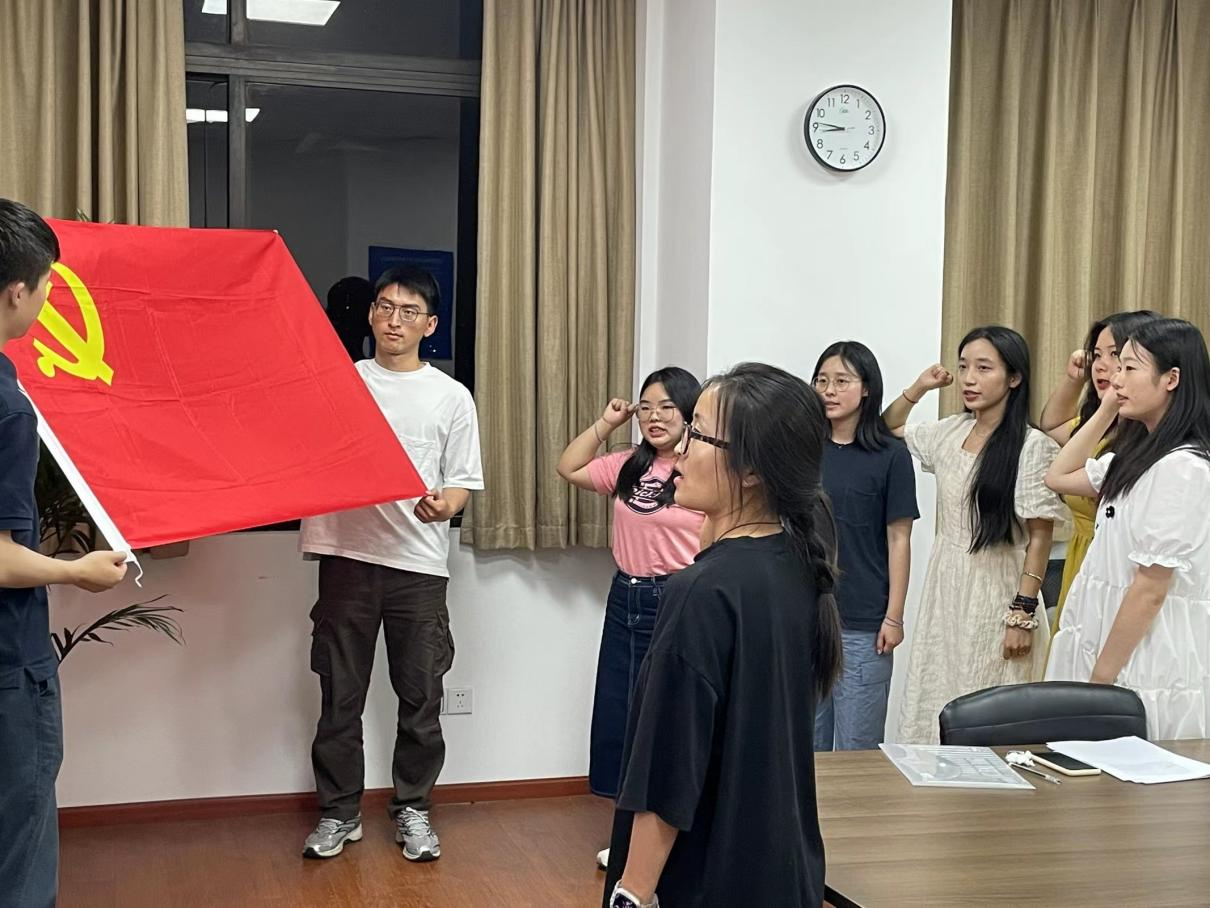 党员大会也由汪双梅同志主持开展。首先,由陈渝、胡蕊、罗欣玥、余姝蕙、喻培林5名发展对象汇报预备期间的思想、工作情况;紧接着由入党介绍人黄靖同志介绍发展对象有关情况,支委会报告发展对象的审查情况;然后在场与会党员发表意见、充分讨论,经过现场与会党员的无记名投票环节,5名发展对象均成功转为预备党员。最后,5名新发展党员对支部大会讨论的情况进行表态,并由汪双梅同志带领预备党员进行入党誓词宣誓。在高昂的国际歌歌声中,本次党日活动拉下帷幕。
