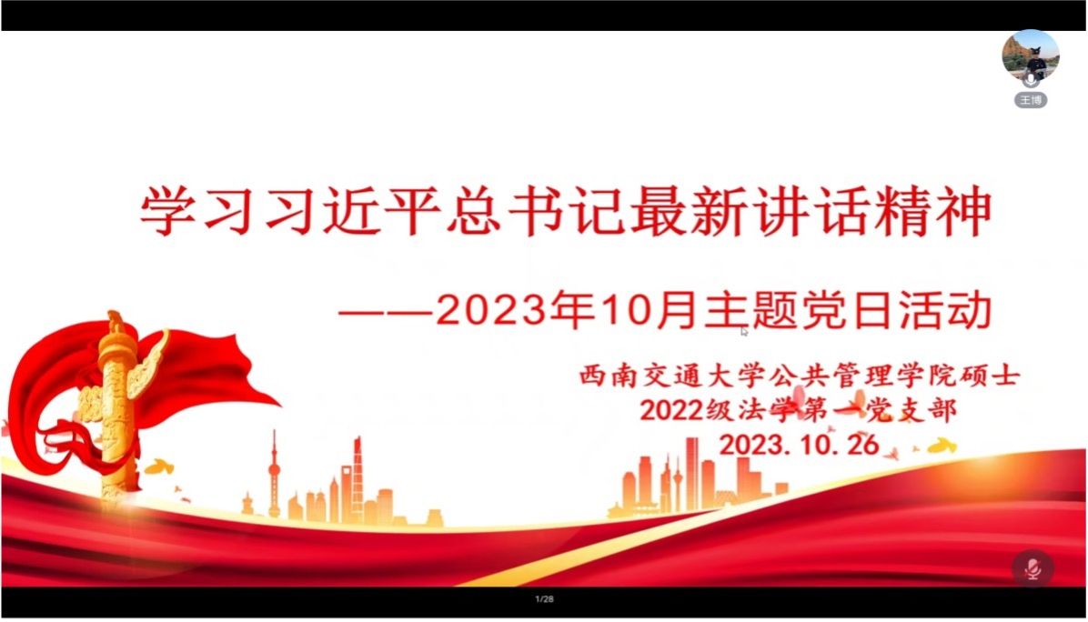 2023年10月26日19:30,MK体育硕士2022级法学第一党支部以腾讯会议的形式开展了“学习习近平总书记最新讲话精神”主题党日活动。本次学习由第三党小组同志主讲,全体党员和入党积极分子参加。