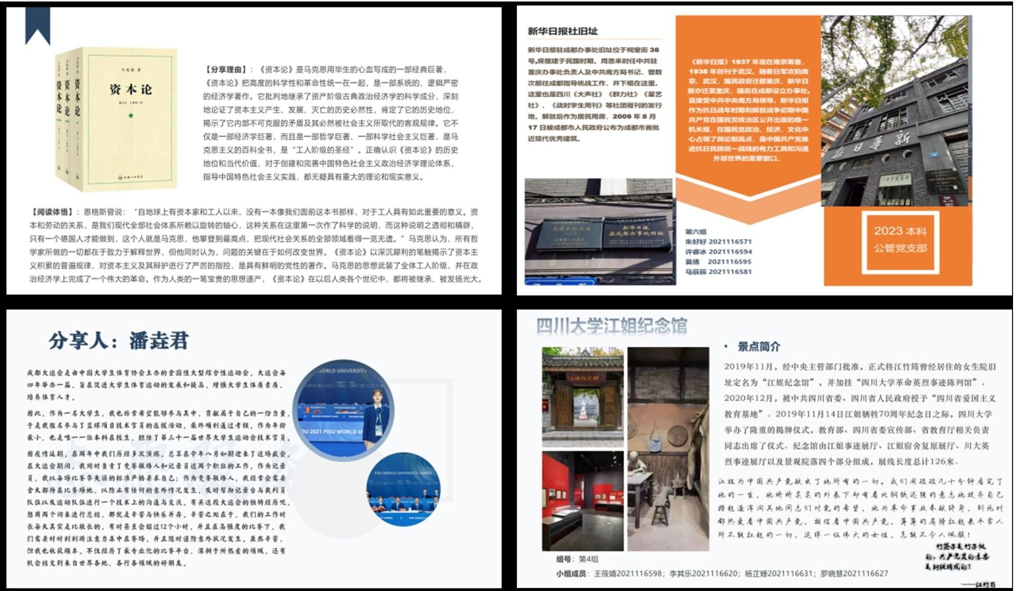 随后,是由本科公管党支部组织开展的分组实践与线上活动。支部邀请对于马克思主义理论有着浓厚兴趣和丰富阅读积淀的程宇钒同学进行经典著作的阅读分享,并撰写近3000字的分享理由与心得,最终将制作成知识卡片,在集体学习中分享传阅,鼓励支部成员读原著、学原理。同时,支部也邀请到了潘垚君同志分享在第三十一届世界老员工运动会中担任篮球项目技术官员的经历,希望通过志愿服务经历的分享让更多的支部成员参与到志愿服务当中,涵养志愿服务精神。除此之外,活动十分重视鼓励支部成员对于乡土情怀、社会实际的了解与关注,在此次活动中,以党小组的形式,围绕人民公园、新华日报社旧址、努力餐等成都市红色旧址进行资料收集、制作资料卡片,引导支部成员主动了解、传承成都市历史上的革命故事、革命精神。
