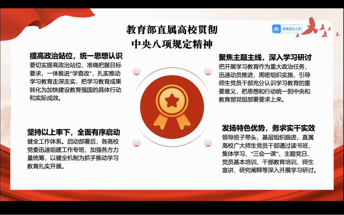 硕士公管安工第一党支部由陈美伶同志带领学习深入贯彻中央八项规定精神学习教育,强调学习教育的重要意义有为实现“十四五”目标提供保障、体现作风建设永远在路上、以作风建设推动高质量发展等。其次,带领学习新时代加强党的作风建设的重要论述,强调作风建设的重大意义、作风建设的明确要求以及作风建设的有效途径等。接着带领学习教育部直属高校学习教育综述,阐述高校学习教育的开展情况有提高政治站位,统一思想认识;坚持以上率下,全面有序启动;发扬特色优势,务求实干实效等。