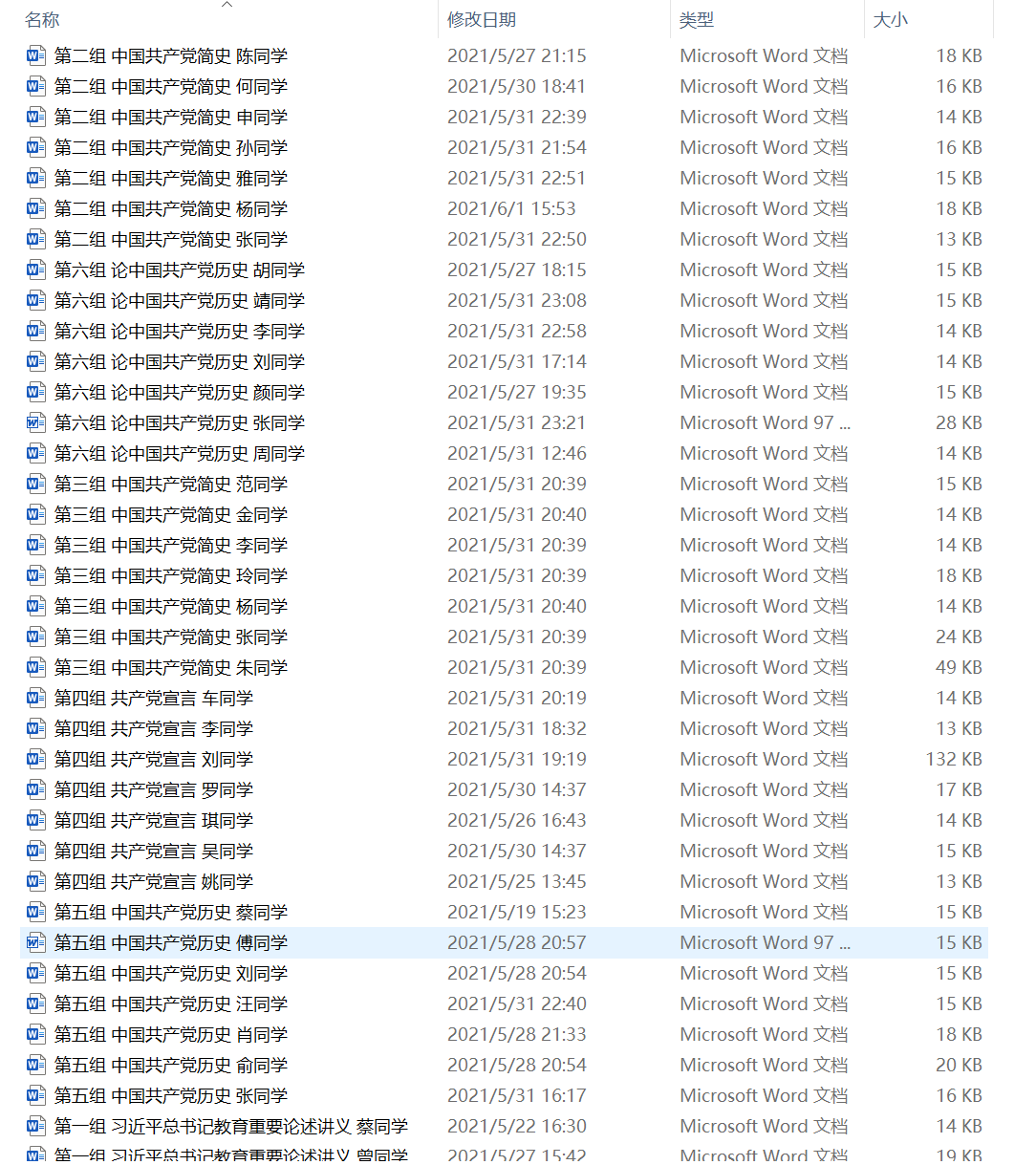 第三小组同学对《中国共产党简史》中“中国共产党的创建和投身大革命的洪流”进行了集中学习,对近代中华民族复兴的历史任务、中国共产党的成立历程与马克思主义在中国的传播等内容进行了解读,从历史实证的角度再次强调了中国共产党的先进性与坚持中国共产党领导的正确性和必要性。全体同学充分理解到要提高政治站位,充分认识到党史学习教育的重要意义,把党史学习作为当前和近期的重大政治任务来完成,持续抓好党史学习教育,时时牢记为人民服务的宗旨,把学党史落实到工作中去,以实际行动去恪守对党的承诺。