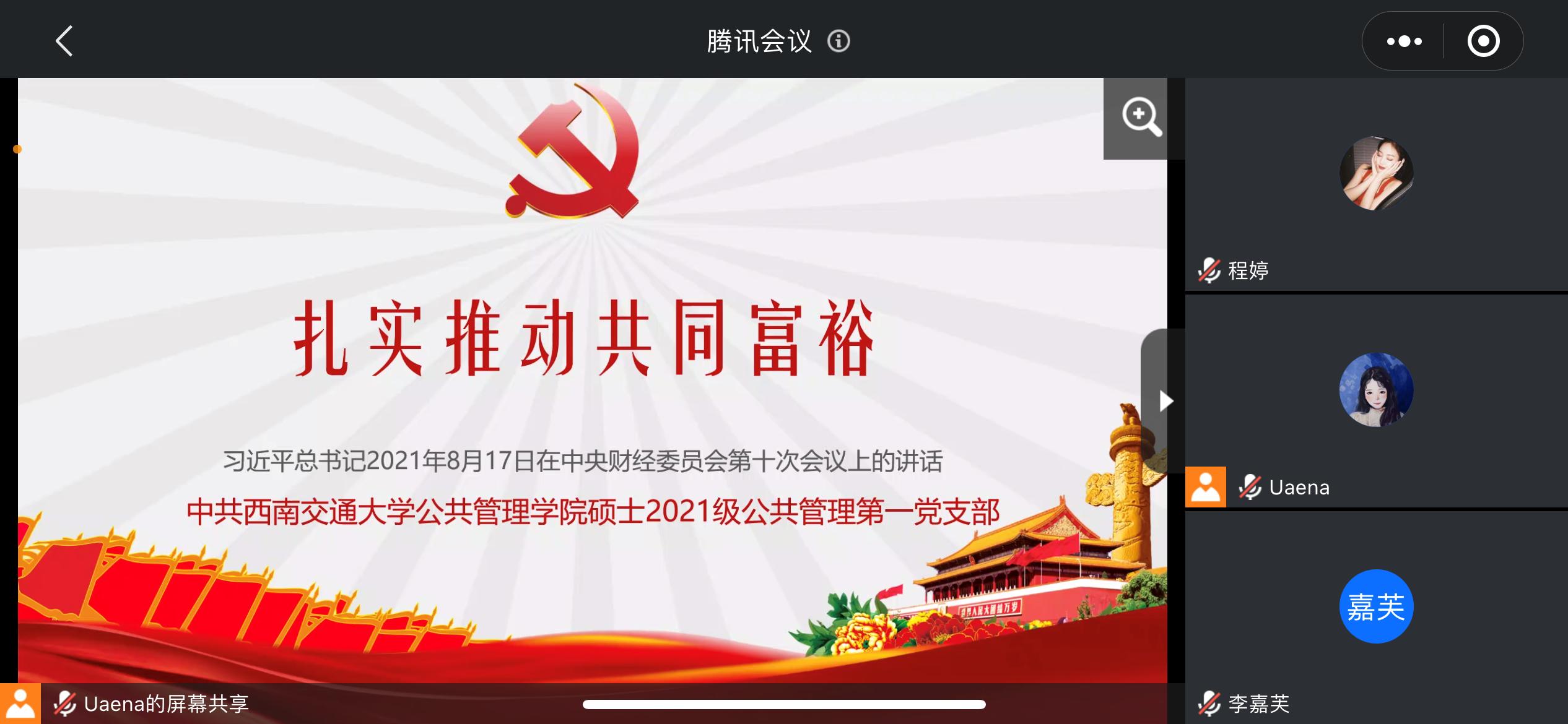 2021年11月2日晚上,硕士2021级公共管理第一党支部在线上开展了定期的党史学习教育,学习内容主要是围绕习近平总书记关于共同富裕的重要讲话,并结合三篇理解共同富裕的文章。硕士2021级公共管理第一党支部全体党员参加了这次学习活动,本次活动由党支部书记蔡笑晗主持。