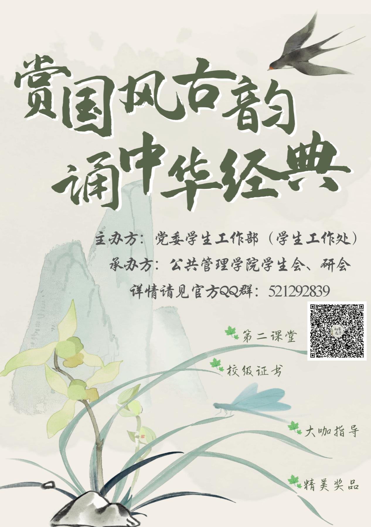 本次古诗词诵读比赛将分为个人赛和团体赛(3-8人),参赛同学需加入活动官方QQ通知群(群号:521292839),报名表及后续赛程安排将于群内公布。观众可加入观众群(群号:554093498)。