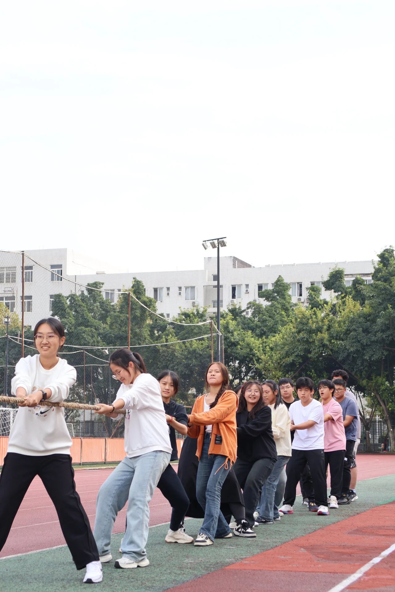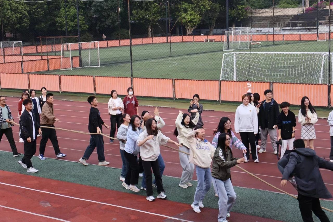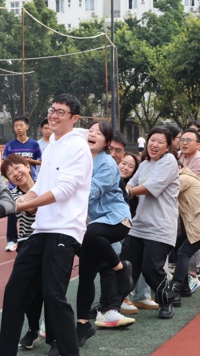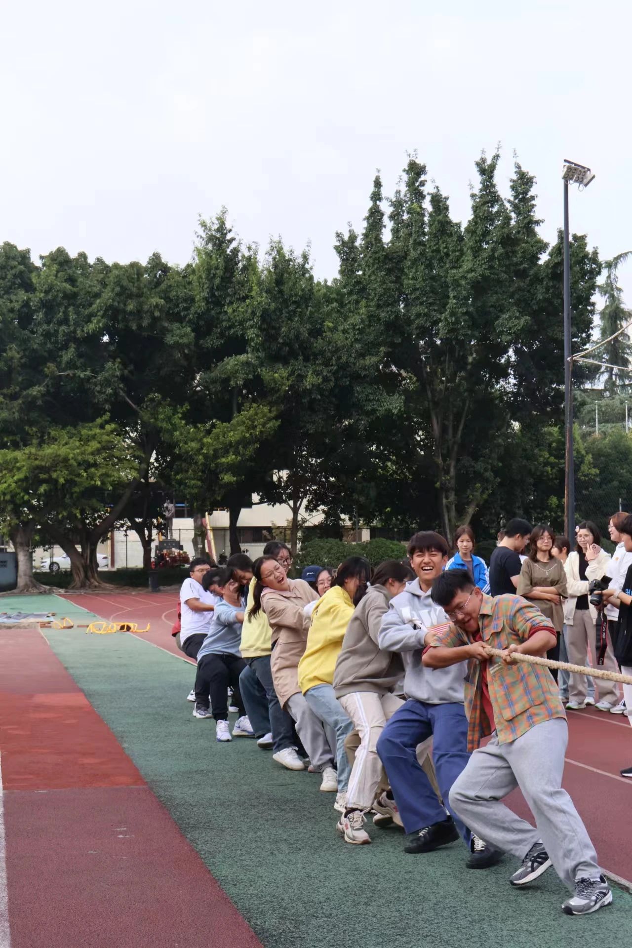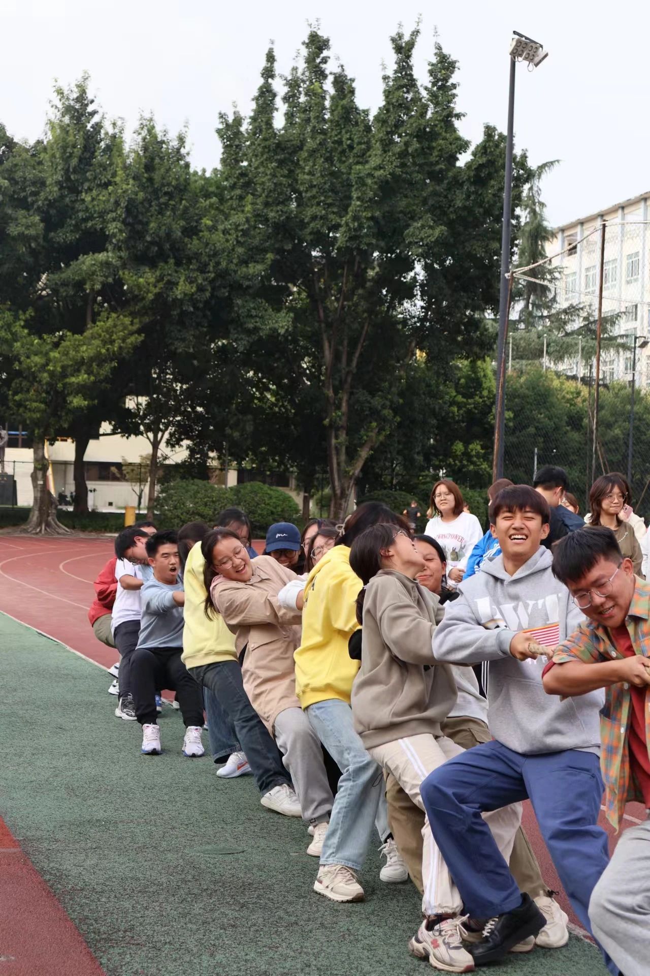 随后,教职工队伍和员工队伍展开了两场友谊赛,老师们一改课堂上的严肃,化身为一个个活力满满的运动员,和同学们用绳索交流情谊。师生双方紧握长绳,使足力气拼命往后拉,呈微仰姿态,“一、二、一、二”,齐声呼号,节奏分明;他们拧成一股绳、汇成一股劲、聚成一条心,共同在场中挥洒汗水,感受体育活动的无穷魅力,相信这段经历定将在师生心中镌刻下永恒的美好印记。