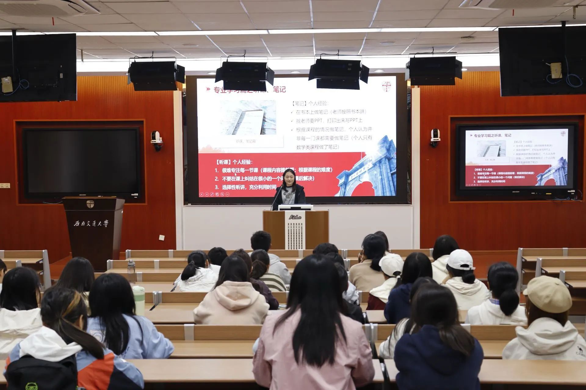法学专业的陈炜婷与张菁妤两位同学也为本科2024级法学专业的新生们带来了一场干货满满的经验分享会。张菁妤同学在分享会上以专业课程学习为切入点,结合科研竞赛与实习实践,介绍了保研的有效策略。此外,张菁妤指出,实习实践是个人成长的重要环节。她建议同学们在规划实习时,优先选择与职业目标契合的机会,以便于未来职业发展并有效实现理论与实践的结合。陈炜婷同学分享了她的经验,强调系统学习和全面发展的重要性。她指出,老员工应摒弃高中教育模式,应当建立系统性的学习方法。陈炜婷同学还强调英语能力的提升,指出英语是学习法学文献和参与国际交流的关键,建议同学们持续提升英语水平。