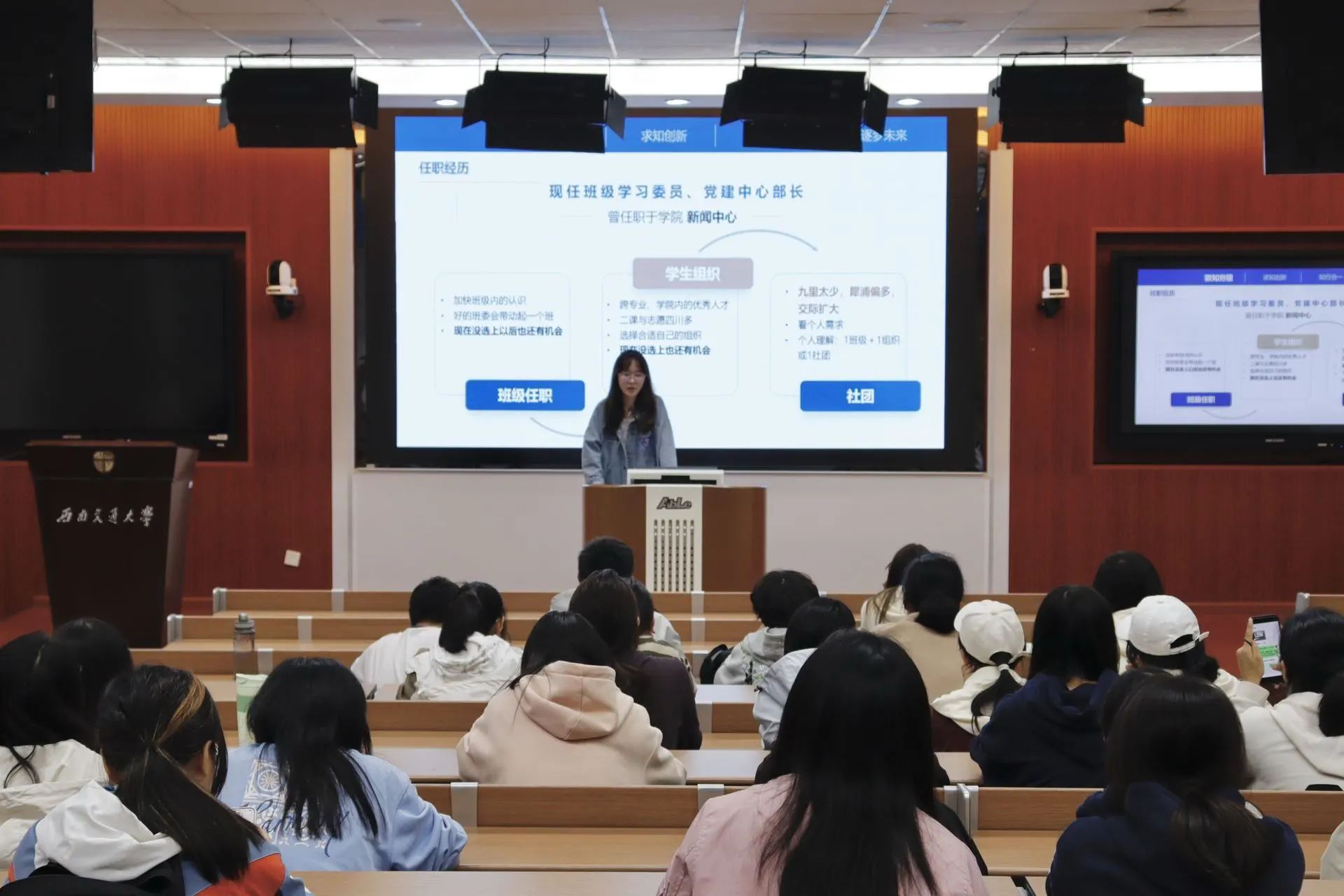 乔楚同学分别从学业规划、专业课学习和科研竞赛三个方面进行了经验教导和分享了自己拼搏三年的心得体会,她指出“不要羡慕别人,要坚定自己的选择,快乐学习,快乐生活,努力活成自己喜欢的样子!”