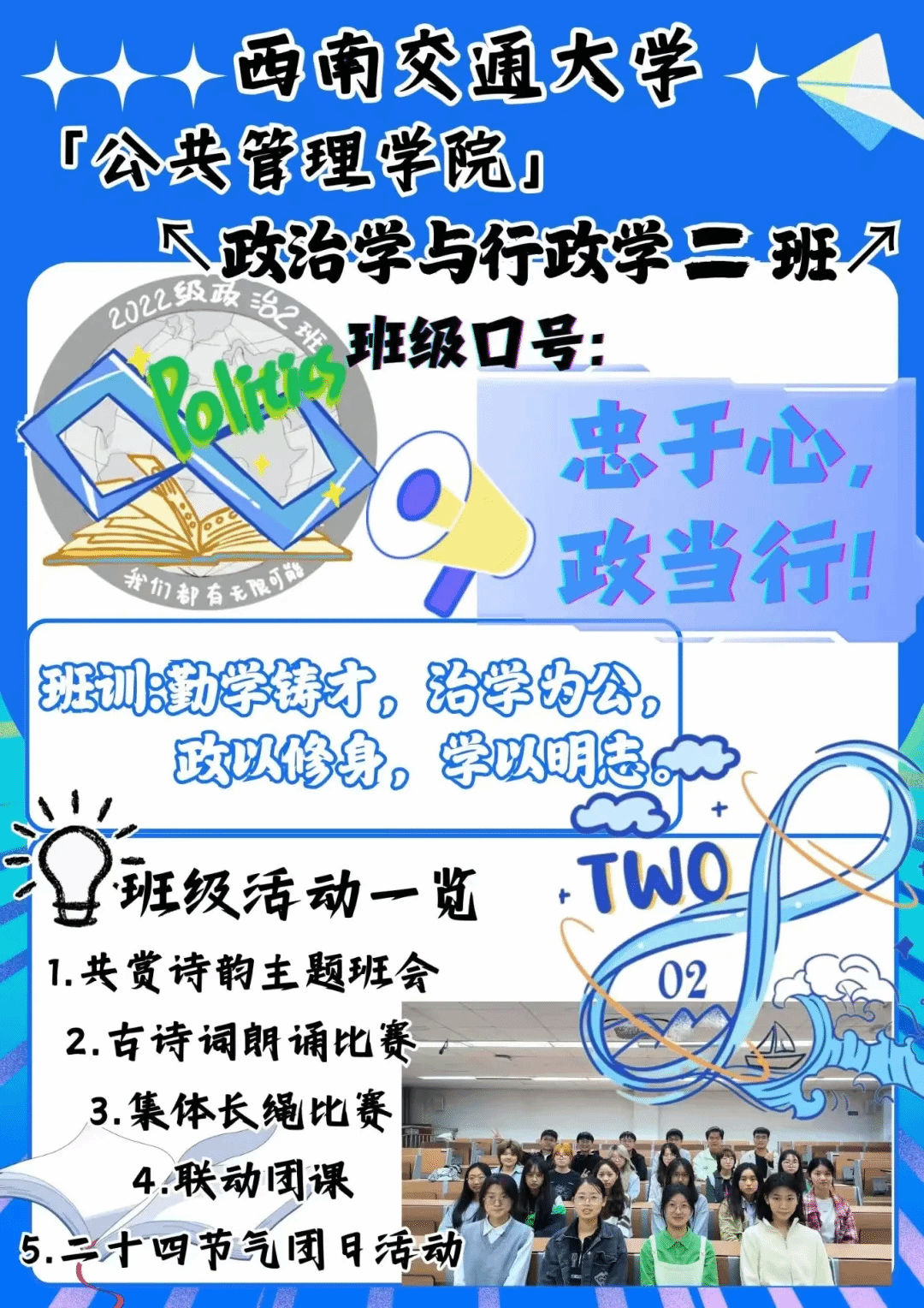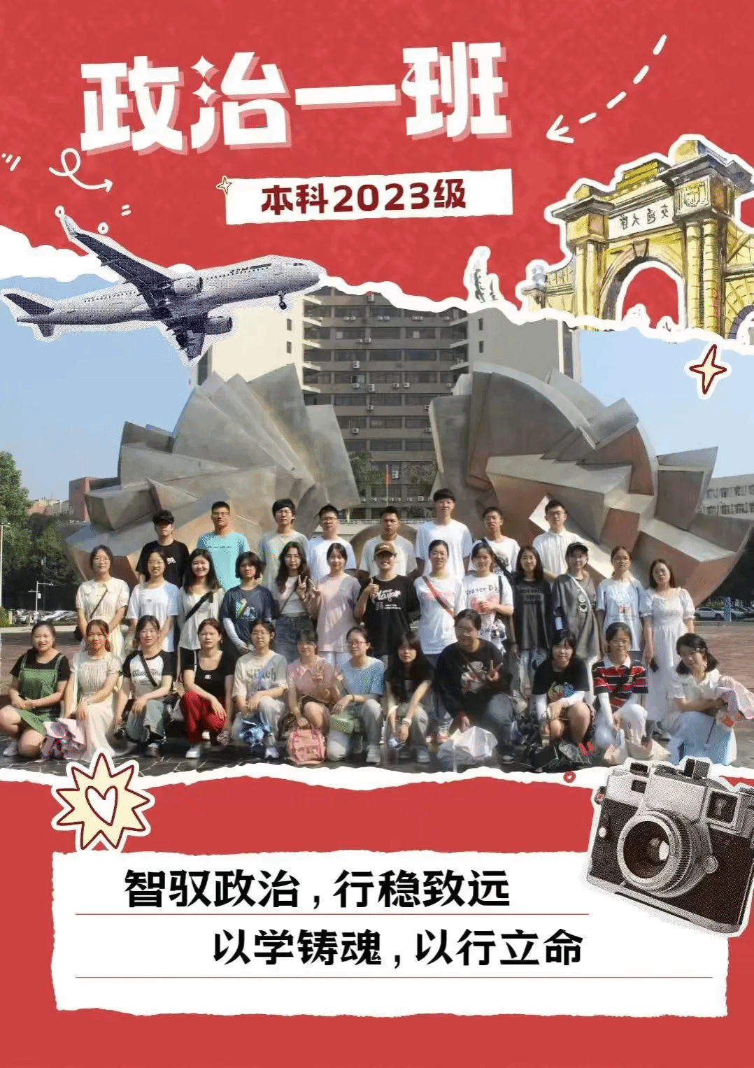 班级介绍:川蜀群峰皆好客,政二今始为君来。政治2023-02班32位同学始终坚持以诚挚的热情,面对学习、生活中的每一个舞台,展现自己的特长,描摹最青春的自我。这32位同学,虽然来自祖国的五湖四海,但是他们用自己的热情和善良构建了一个和谐团结的班集体,用自己的努力创造了一个精彩多样的大一生活:无论是在院青协中着力奉献,还是在员工会中展现自我;无论是金榜题名,学习方面勇踏潮头,还是慷慨激昂,丈量祖国大好河山,班集体中的每一位同学都各具特色,都是政治二班这个大家庭中独特闪耀的一份子。鹏程九霄,抵南海娓娓不倦;龙腾万里,跨三界久久为功。路有繁花,前有硕果,政治二班不倦前行,终不负积年奋进之功。