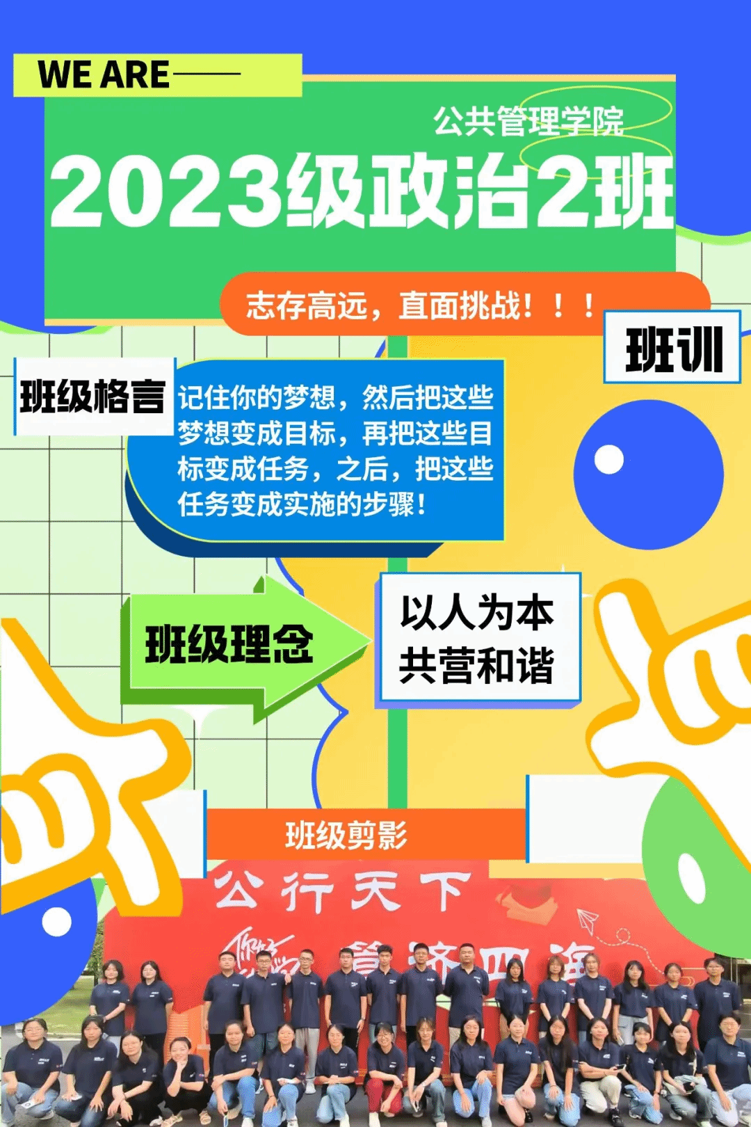 班级介绍:公共2023-02班是一个充满活力和凝聚力的集体。我班牢记“钩玄锁隐,跬步千里”的班训,致力于成为具有公共意识、具备专业素养的人才。在学习上,我们精益求精,将实践与理论相结合;在社会实践里,我们实事求是,用辩证的眼光看待社会问题;在志愿活动中,我们团结协作,以赤诚之心奉献青春力量。同时,本班积极开展班级活动,不定期举行读书分享会、校级专项实践活动、团日活动等,推动班级建设。公共事业管理2班是一个团结向上、生机勃勃的优秀集体。在未来的日子里,我们将携手共进,努力奋进,深耕于公共事业,为社会发展进步奋斗。