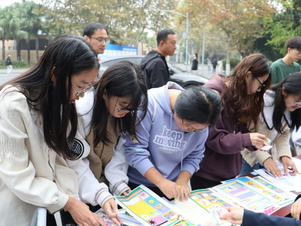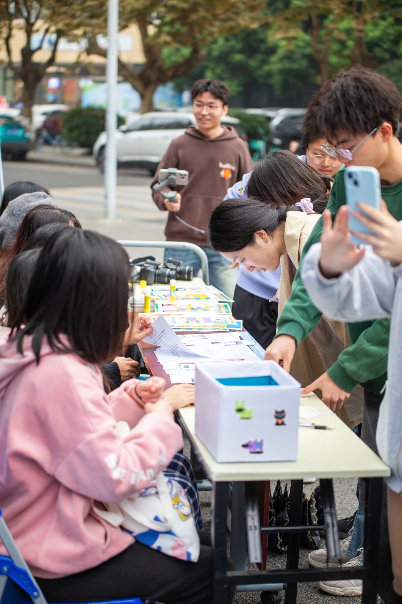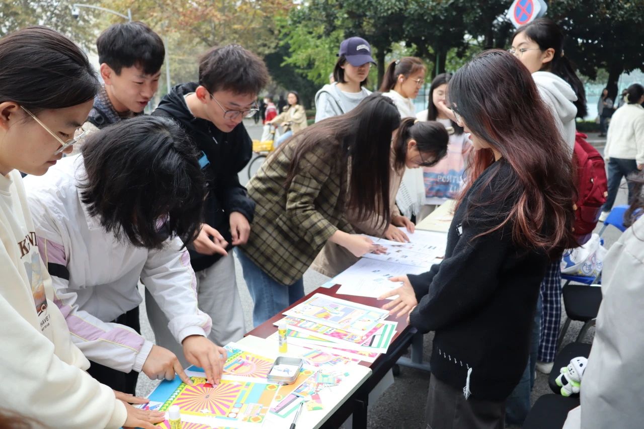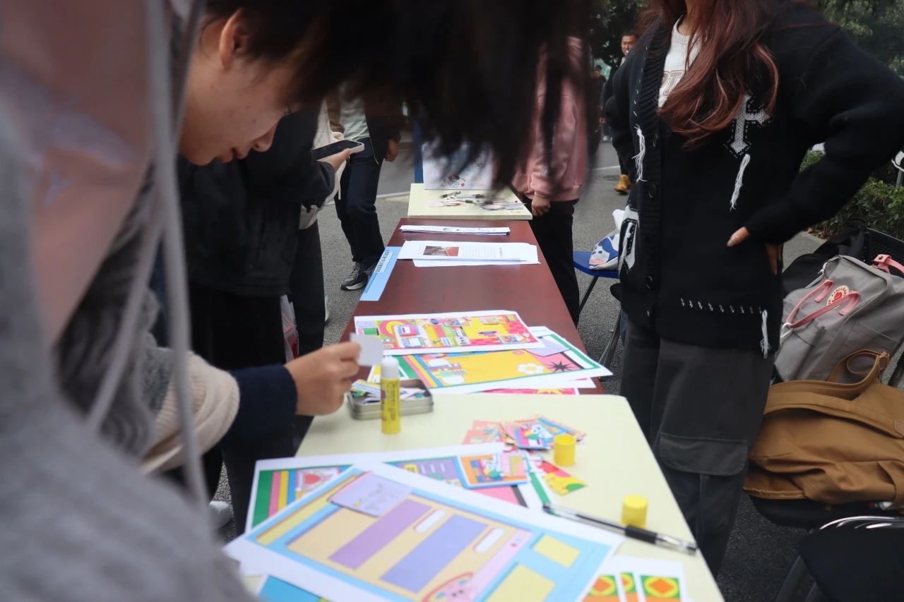 记者体验活动于上午11:30准时开始,期间由于天气原因,举办“阵地”从一食堂十字路口迁至四号教学楼入口处,但细雨并未浇灭大家的热情。