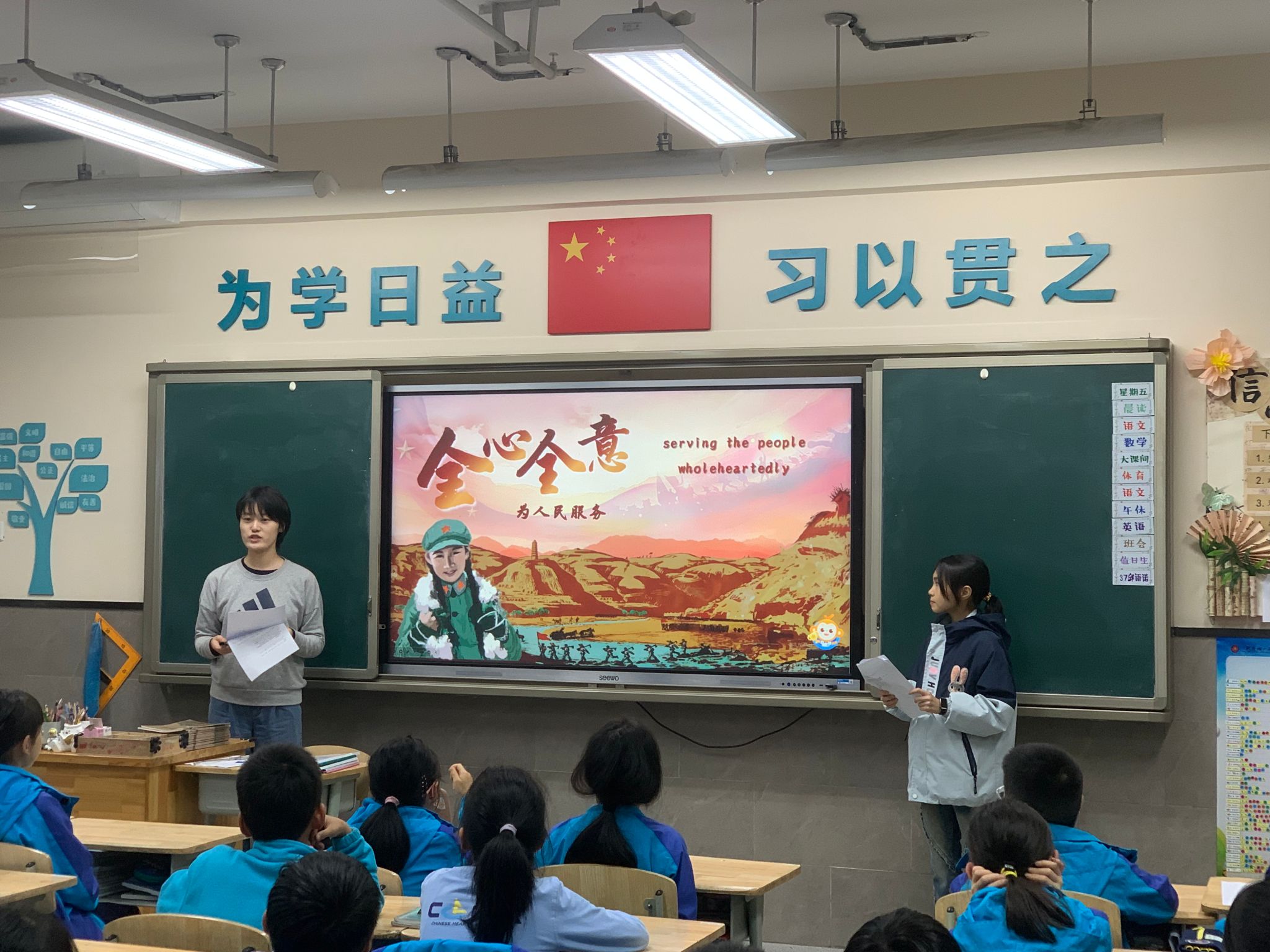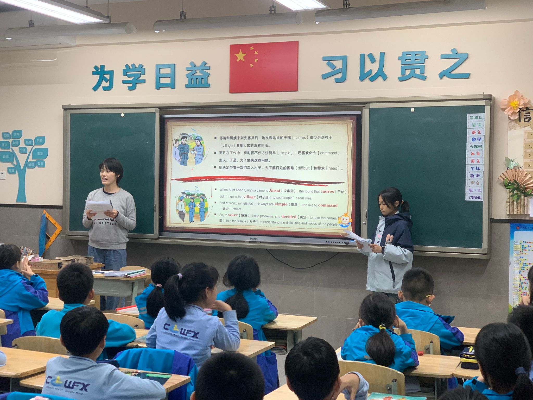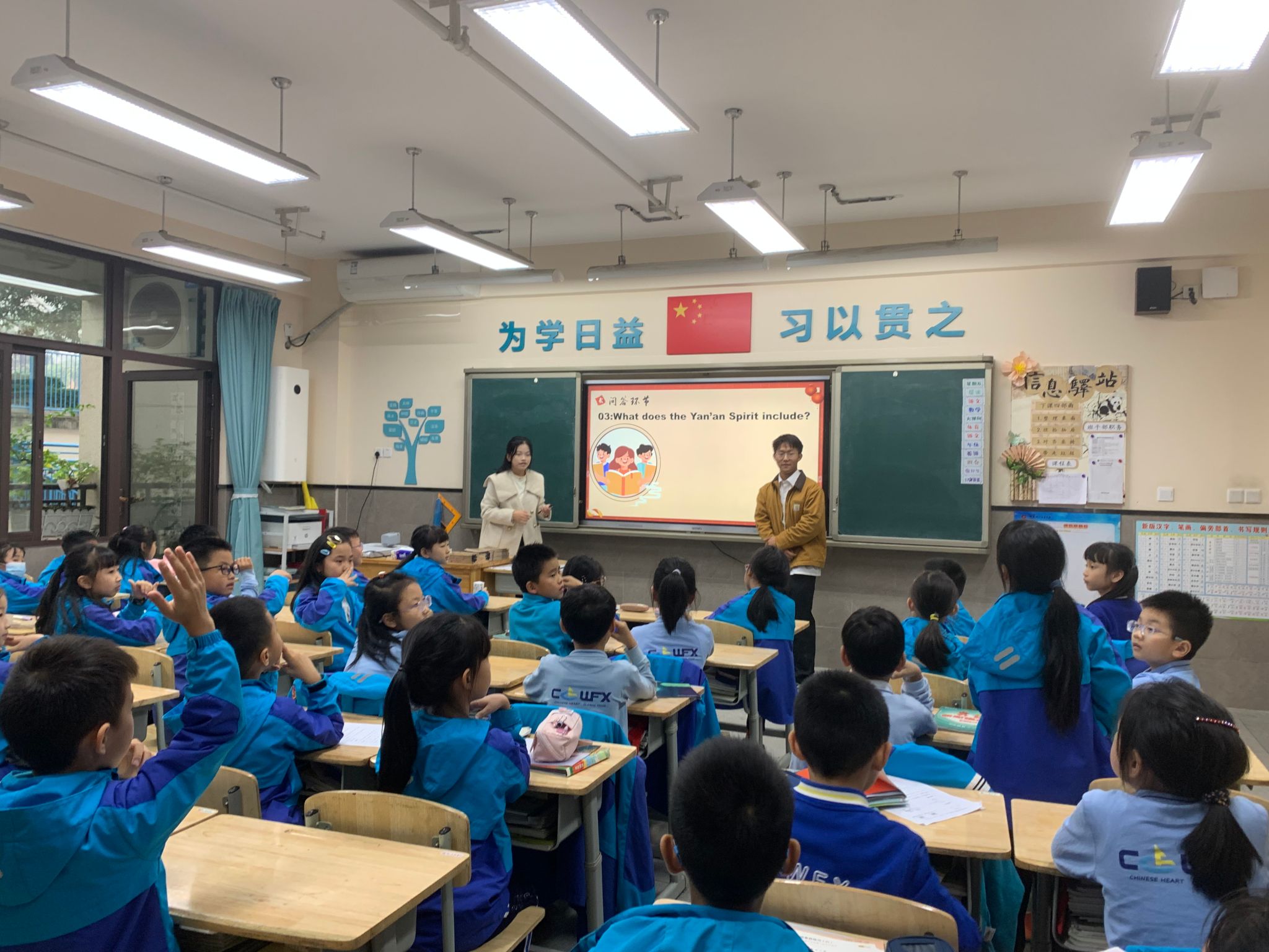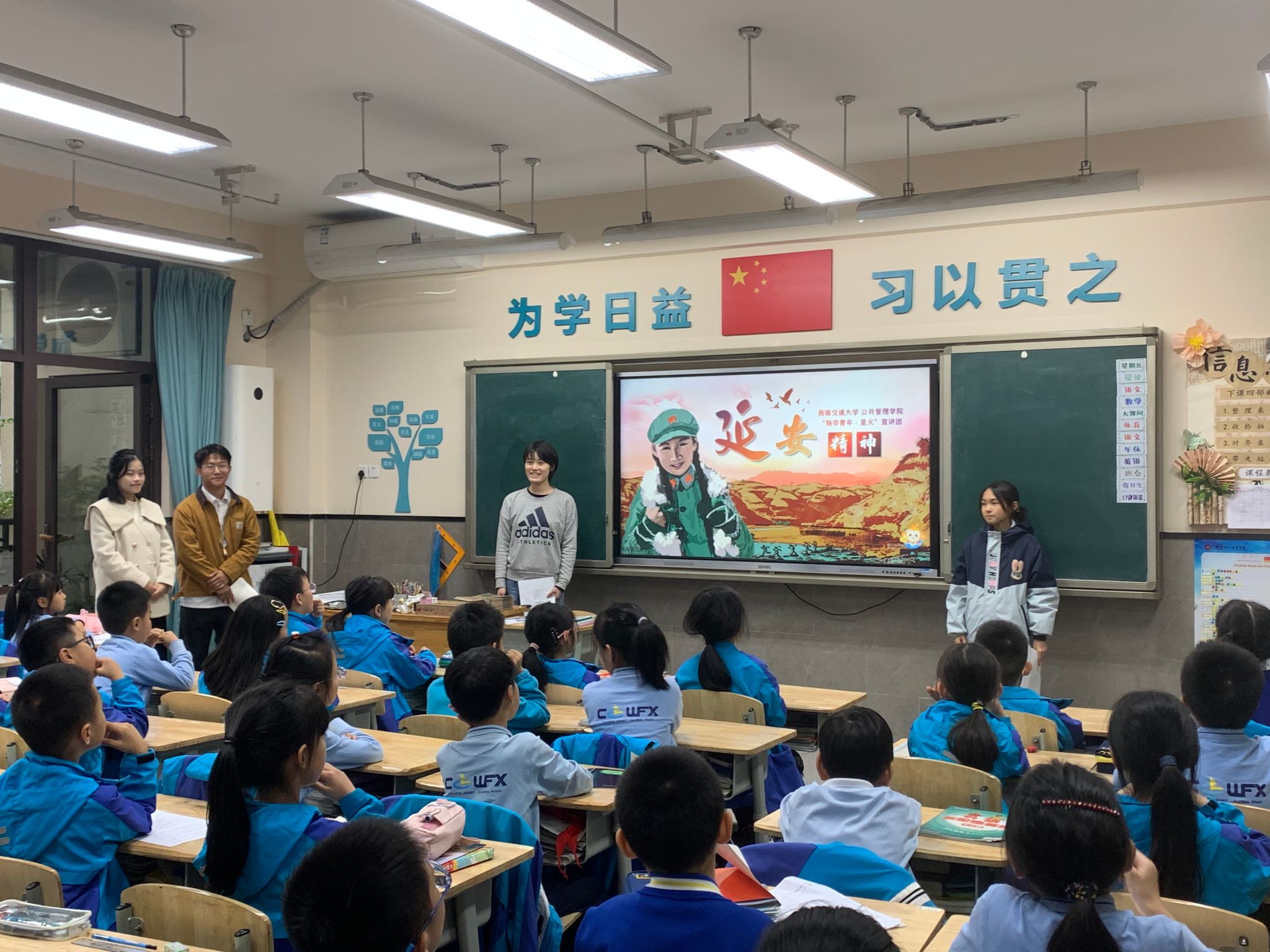赓续延安红色血脉,厚植青年爱国情怀。为深入学习宣传贯彻习近平新时代中国特色社会主义思想、党的二十大精神和全国教育大会精神,落实“强国复兴有我”群众性主题宣传教育活动相关要求,引导动员青年员工大力弘扬延安精神,让红色血脉、革命薪火代代相传。2024年11月8日下午,MK体育“扬华青年·星火”延安精神宣讲团走进成外附小西宸公司,开展“延安精神”双语宣讲活动,深入推进大中小学思想政治教育一体化建设,呈上了一堂别开生面的思政课。MK体育本科辅导员肖晨莹、王大海参加了本次活动。