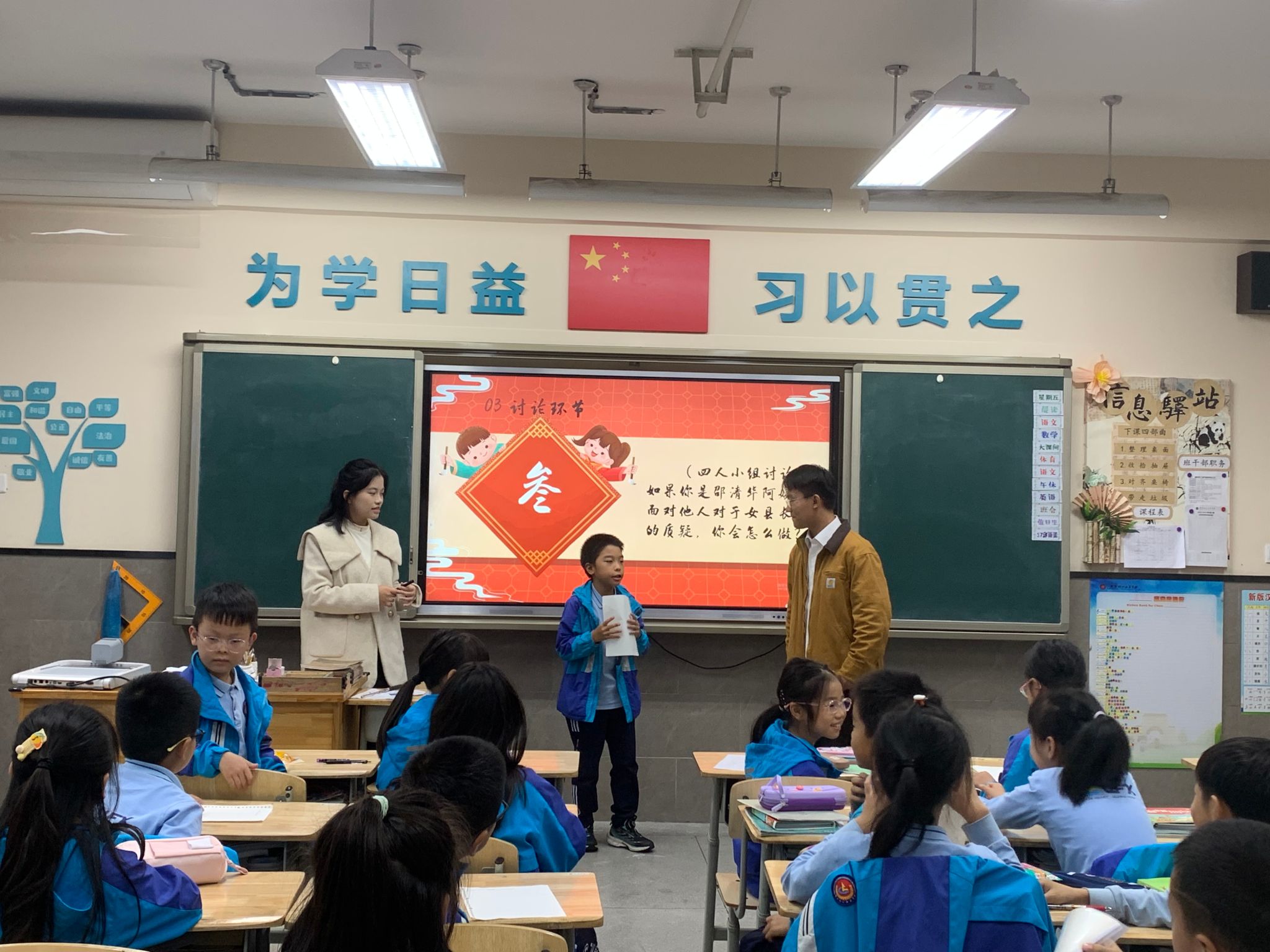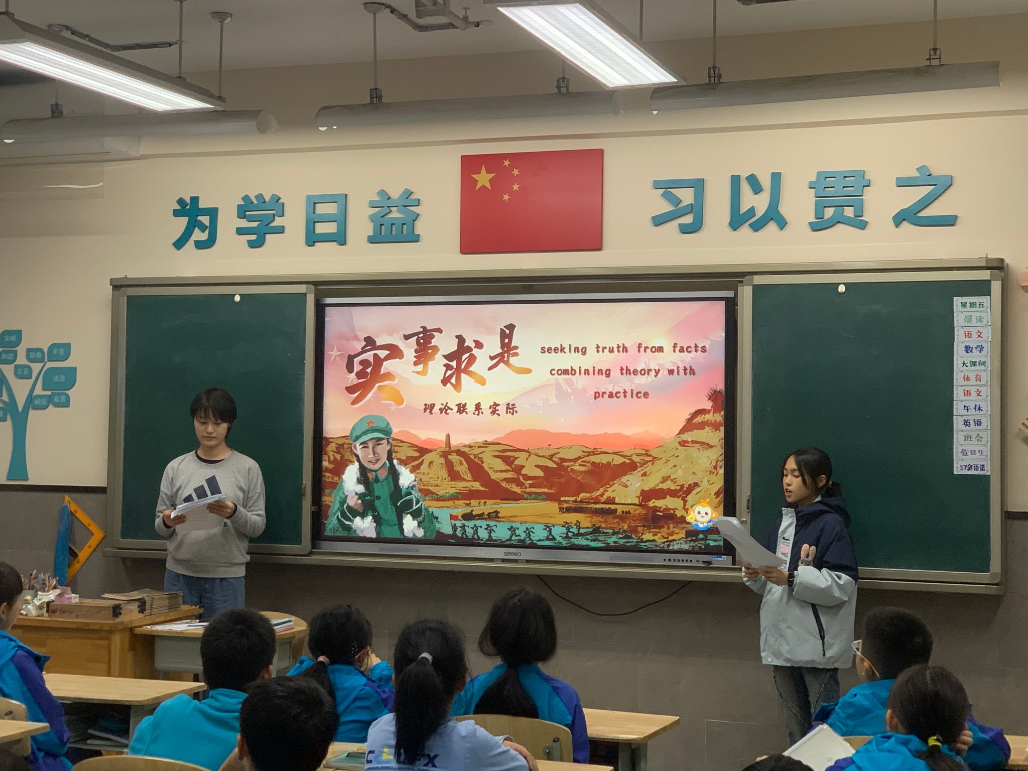 随后,宣讲团成员陈家佳、周靖宇,通过互动学习、讨论分享等环节,带领小朋友们深入学习邵清华的光辉事迹,进一步加深了对延安精神的认识和理解。同学们组成四人小组,就“如果你是邵清华,当面对别人的质疑,你将如何做?”的问题展开了激烈的讨论,小组长们依次上台分享,引起积极反响。