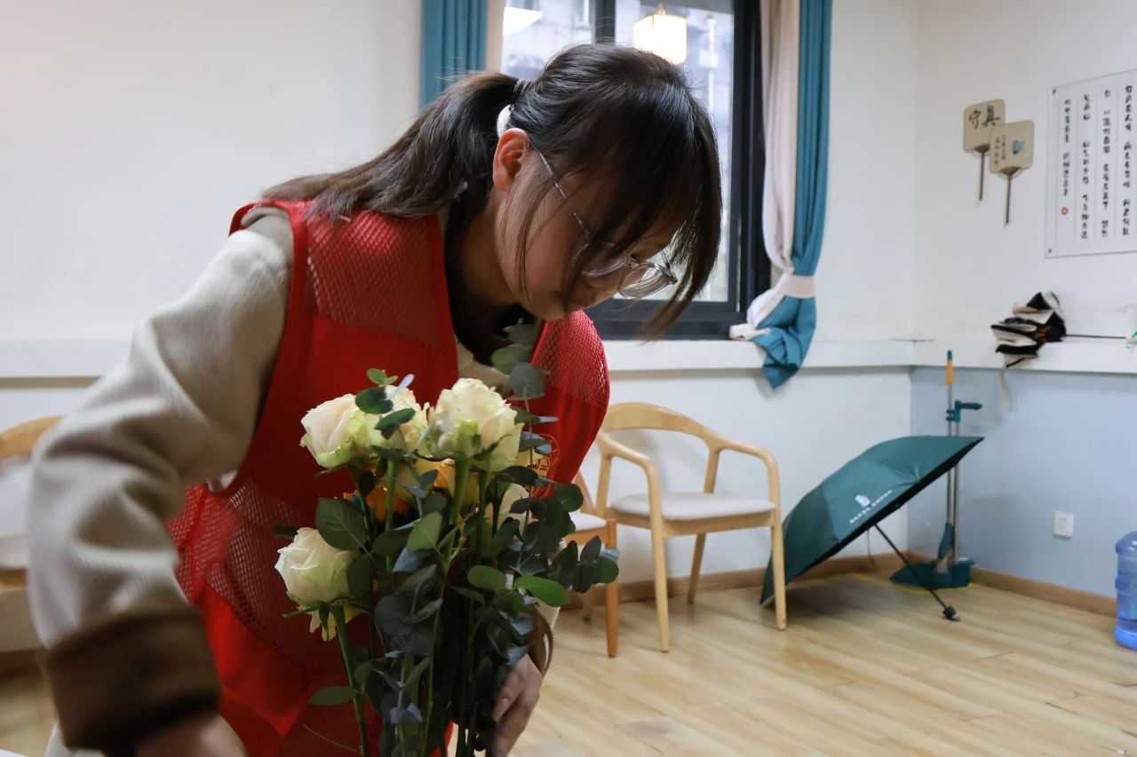 花束制作完成后,志愿者们分为3个小组,在社区工作人员的带领下,依次探访社区妇女居民。志愿者们献上精心制作的向日葵花束,向她们送上热情真挚的节日祝福。志愿者们嘘寒问暖,关切地询问她们的生活近况,并对社区老年妇女们表达了亲切的问候,倾听她们的人生故事,致敬她们辛勤付出的岁月,并祝愿她们生活如愿、身体康健、生命如向日葵般绚烂绽放。女性居民们对志愿者们的到来也十分感动,纷纷表达诚挚的谢意,并鼓励他们努力学习、砥砺前行,为社会贡献更多力量。