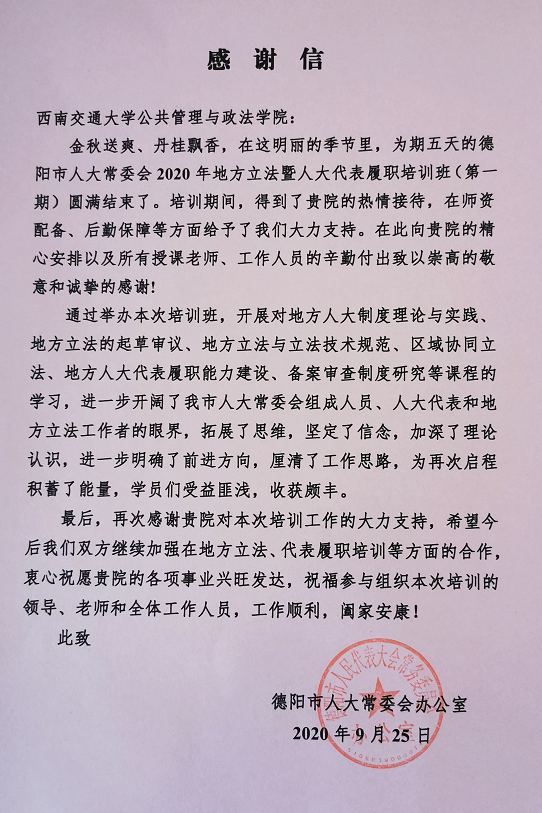 本次培训得到了德阳市人大常委会的高度重视,并对MK体育四川省干部教育培训高校基地的培训服务工作表示感谢。