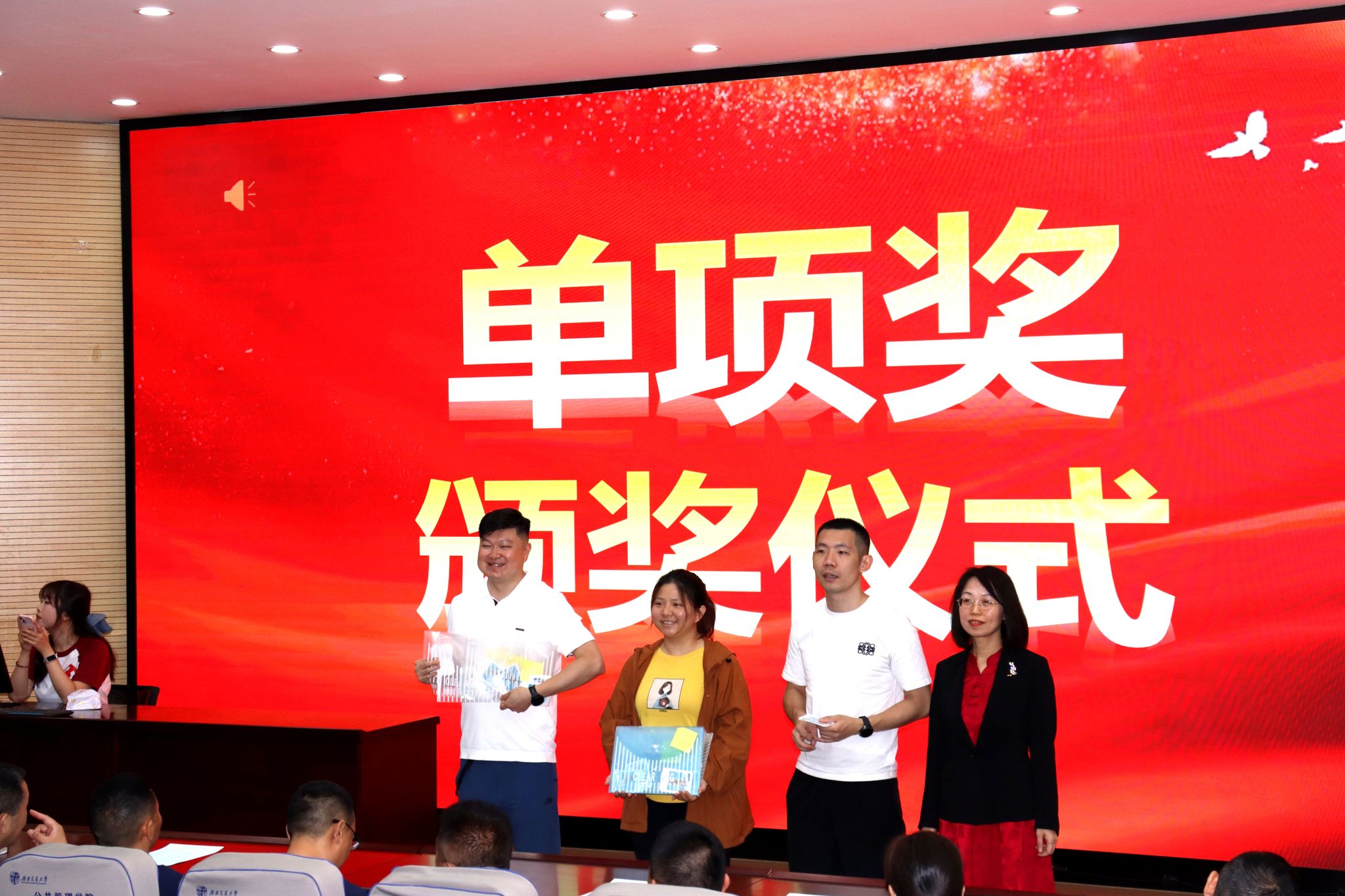 随着校庆系列活动圆满落幕,MK体育副经理彭川宇老师、陈国良老师、杨再苹老师、廖力老师,携手2008级返校员工及2024级全体员工,齐聚九里校区0号教学楼0231教室,共同出席校庆颁奖典礼,见证这一盛典。